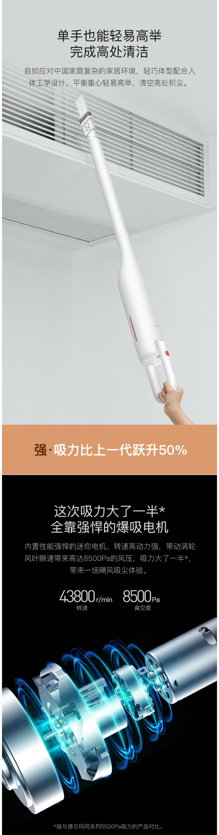 内置性能强悍的迷你电机,带动涡轮风叶瞬速带来高达8500Pa的风压,真空度可达8500Pa,相比上一代吸力提升约50%;实验搭配吸盘测试可轻松提起50斤箱子,配有二合一扁吸头、地刷、内置2200mAh锂电池,满电后能提供30分钟续航,无线使用更灵动,车载、电脑、充电宝可直接为其充电,非常方便。