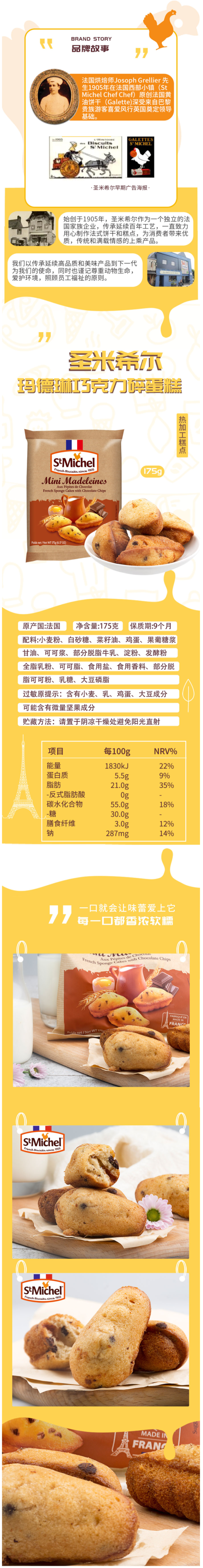 这款圣米希尔 玛德琳巧克力碎蛋糕,法国原装进口,使用小麦粉、动物黄油、椰子、白砂糖、鸡蛋等烘焙而成,小麦粉能追溯供应链,产地都是远离公路、工厂和污染源,保证纯天然的品质,入口松软,香味十足。