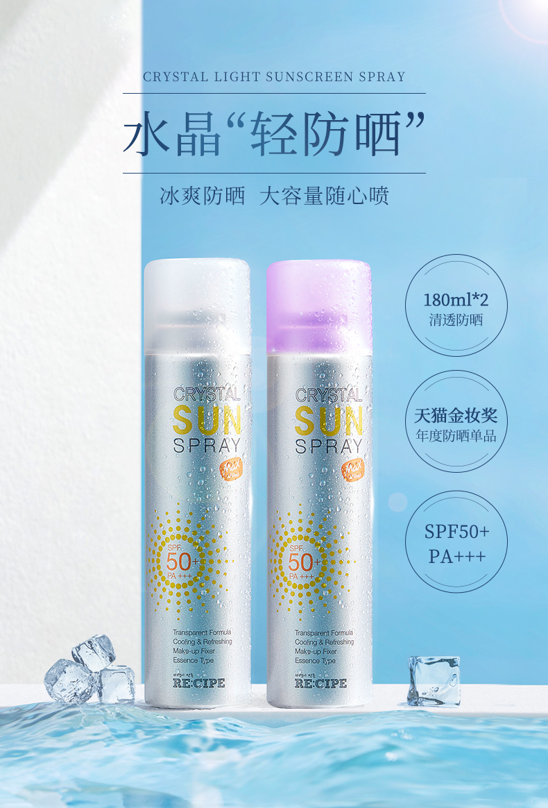 RECIPE 水晶防晒喷雾,在《花儿与少年》的节目中,娜扎用的就是这款防晒喷雾。年度明星单品,不含化妆品类10种传统的有害物质,获得了食品标准级的韩国国立农产品认证局的有机产品认证书,通过了敏感性皮肤和无过敏测试,孕妇和儿童也可放心使用。