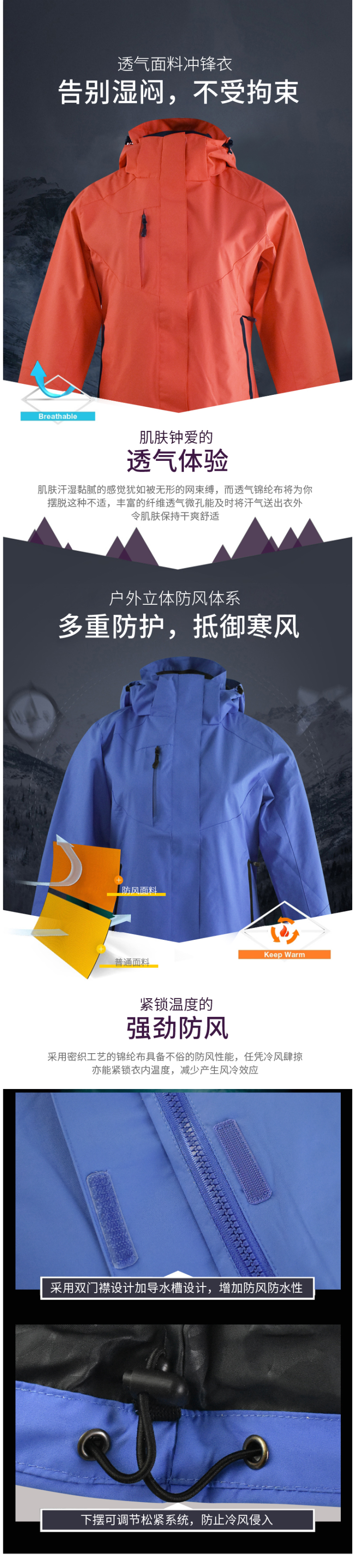 双重门襟设计,特别增加了导水槽,增加了防风疏水效果。下摆有可调节松紧系统,防止冷风侵入。袖口是魔术贴+弹性松紧带设计,根据需要进行调节松紧;两边的插袋都有拉链,置物安全。