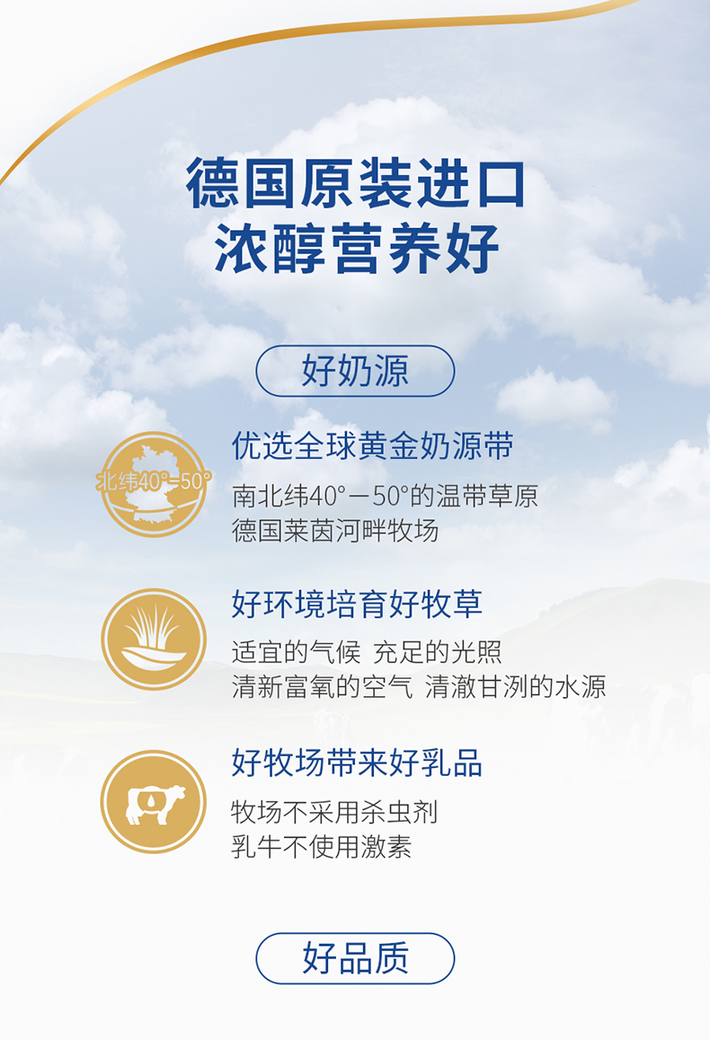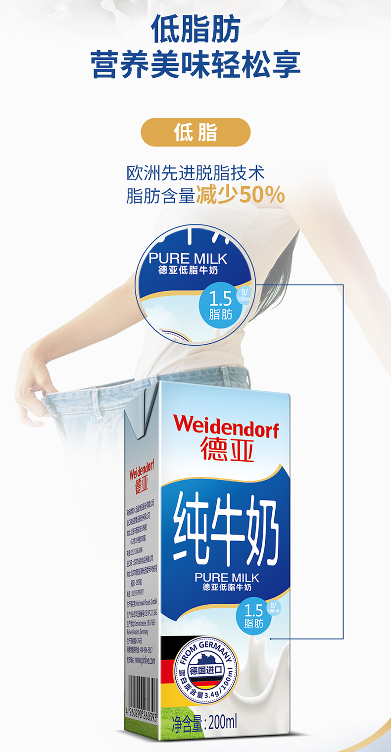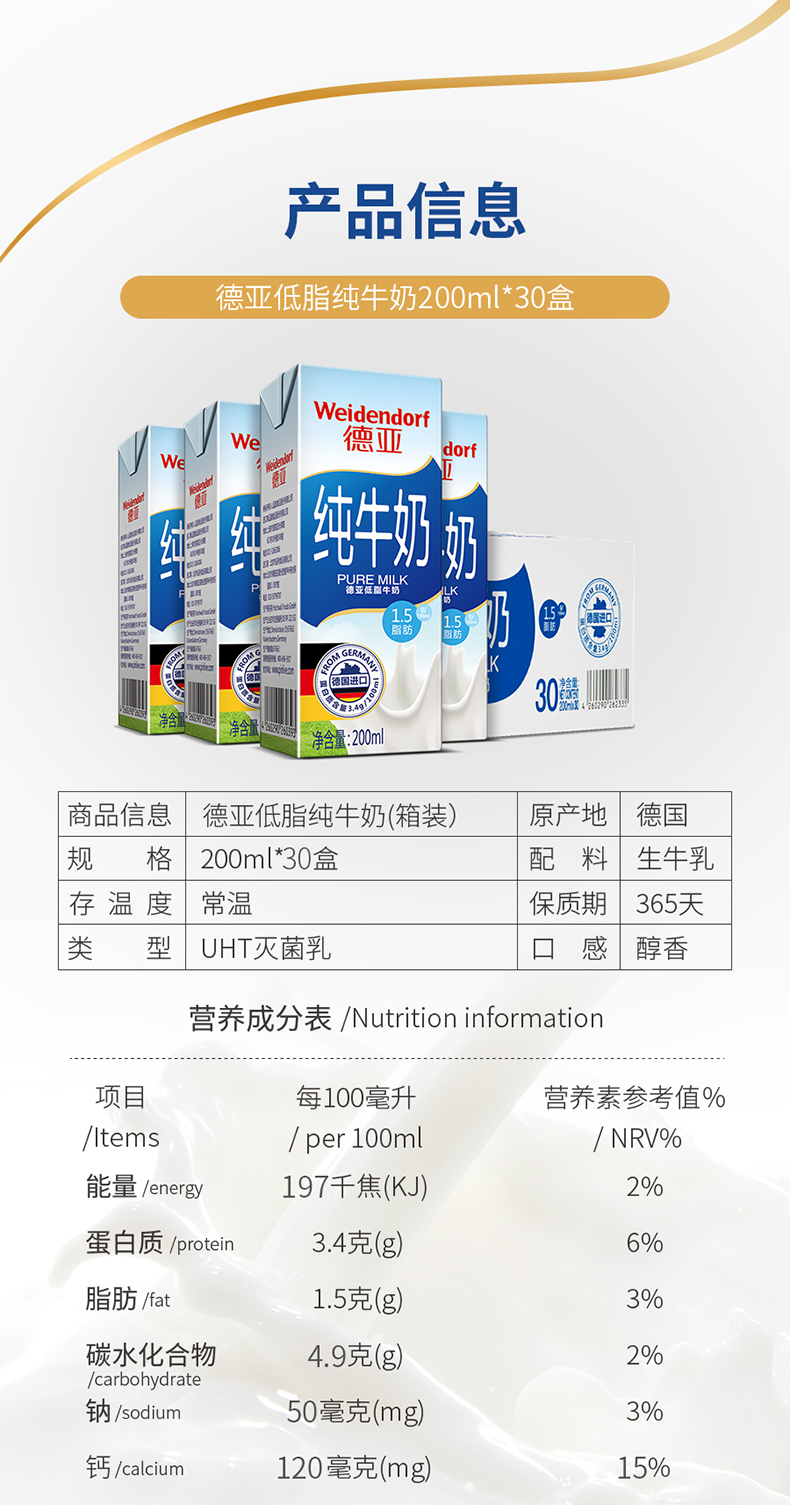 德国原装进口牛奶,乳源来自南北纬40~50°的温带草原德国莱茵河畔牧场里的奶牛,奶香纯正浓郁,采用欧洲先进脱脂技术,脂肪含量减少50%,钙含量120mg/100ml,脂肪含量1.5g/100ml,蛋白质含量3.4g/100ml,高钙低脂更易吸收。并经IFS认证,从奶源、加工到包装一系列溯源把控,食用健康安全。