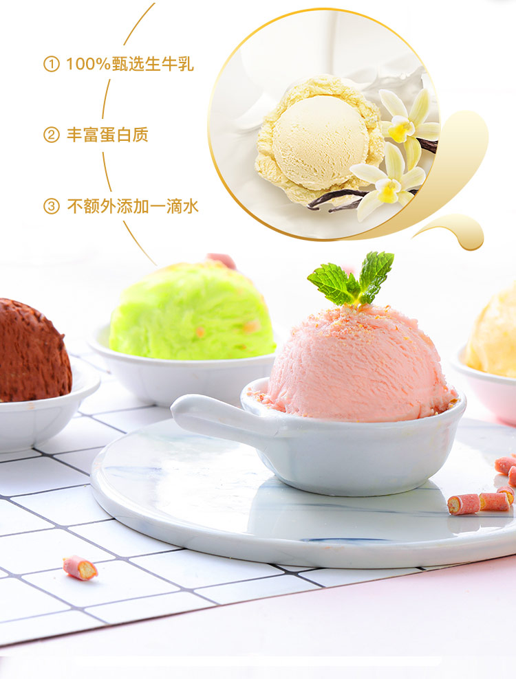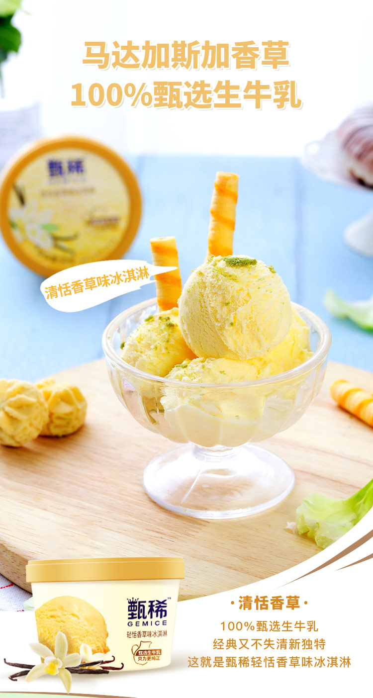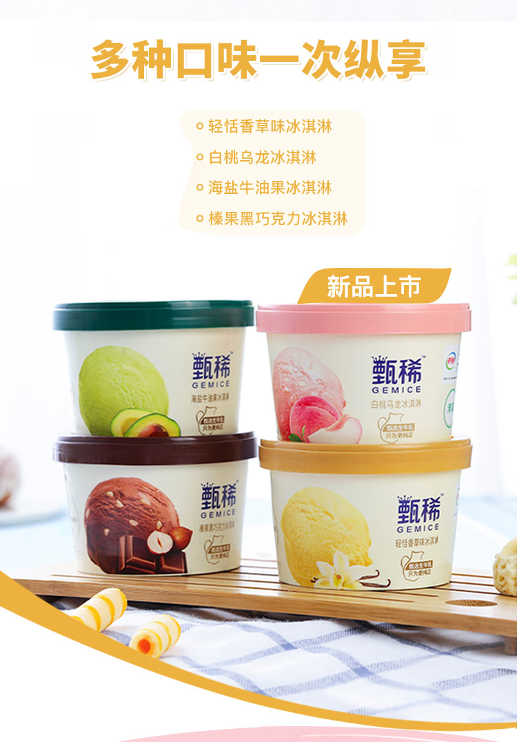 这款甄稀 伊利香草冰激凌,是李现同款,每份含牛油果、榛果黑巧、白桃乌龙和香草4种口味,各4杯。选用微米级细小奶料,经过每分钟1000次研磨,口感非常细腻。