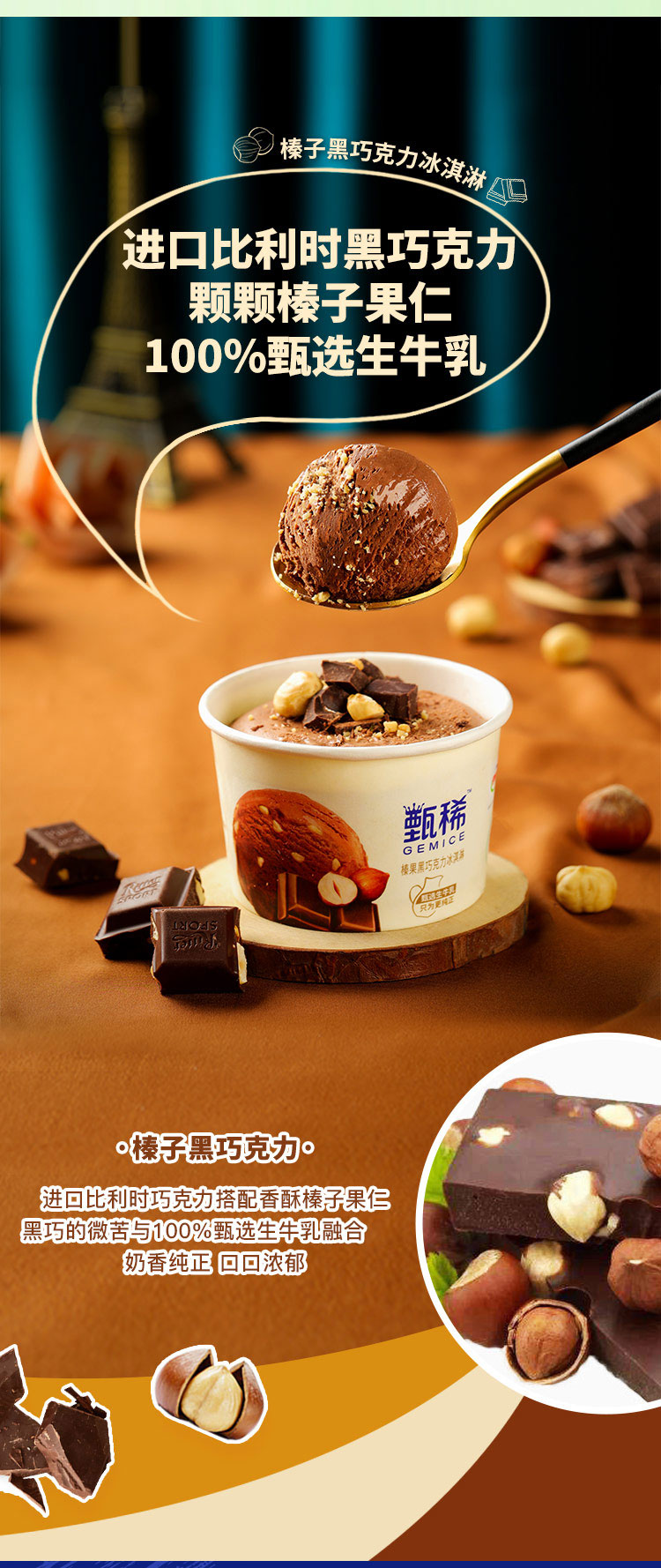 榛果黑巧克力:甄选比利时进口黑巧克力,黑巧克力的微苦与冰淇淋的清甜完美平衡,再撒入颗颗榛子果仁,浓醇绵密中夹着一丝丝酥脆香甜。