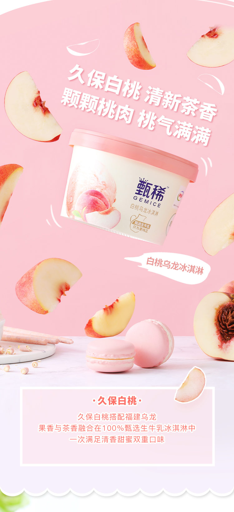 白桃乌龙味:优选久保白桃和福建乌龙茶,果香与茶香融合在100%臻选生牛乳的冰淇淋中,一次满足清香和甜蜜双重口味。