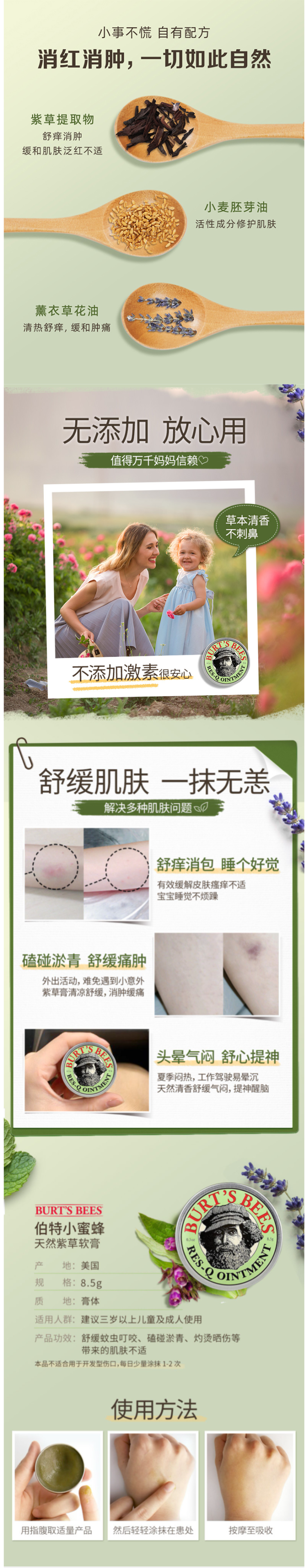 这款伯特小蜜蜂 紫草膏,在天猫止痒类目中累计销售额NO.1,美国进口,萃取天然植物精粹-紫草叶提取物、小麦胚芽油、薰衣草花油,无激素和其他添加,具有舒痒消包、舒缓肿痛、舒心提神的的功效,味道也很好闻。