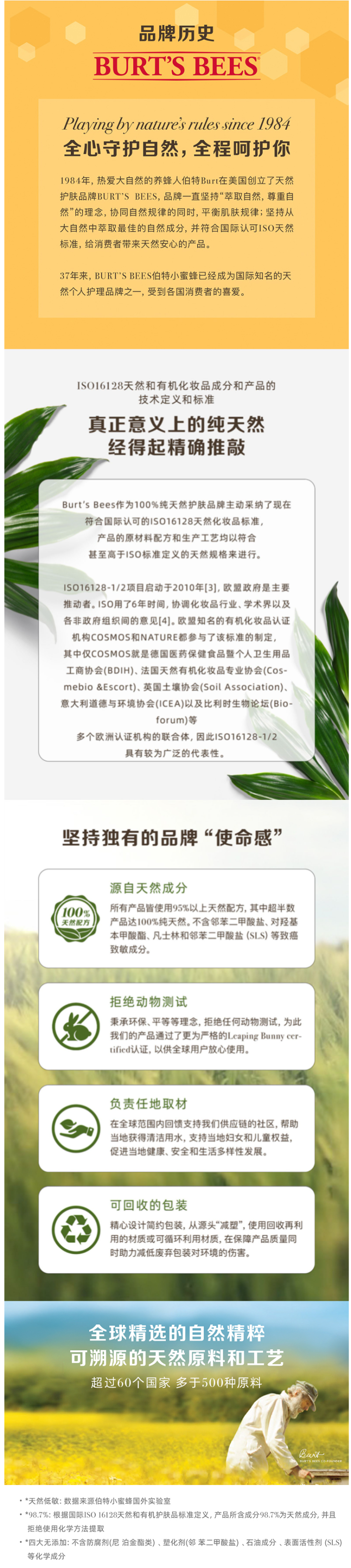 1984年Burt's Bees诞生在一个养蜂场,1991年研发出来了润唇膏并且成为明星产品,至今制造超过150项产品,涵盖肌肤保养、身体保养、秀发保养、唇部保养、男士专用、婴儿保养及户外防晒系列。