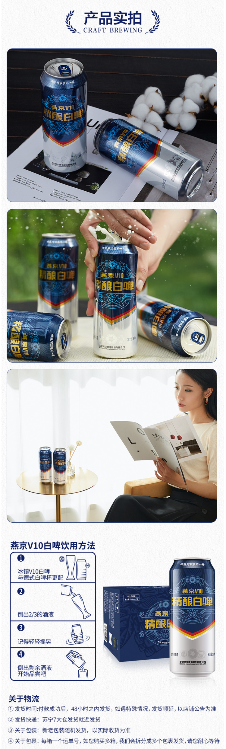 这款燕京 V10 精酿白啤,使用水、麦芽、小麦芽、啤酒花、酵母为原料酿造出云雾般的酒液。慕斯状的泡沫绵密细腻,麦香浓郁,入口清新顺滑。淡淡的丁香花香气,给你不一样的饮酒体验。酒精度≥3.3%vol,原麦汁浓度10°P。