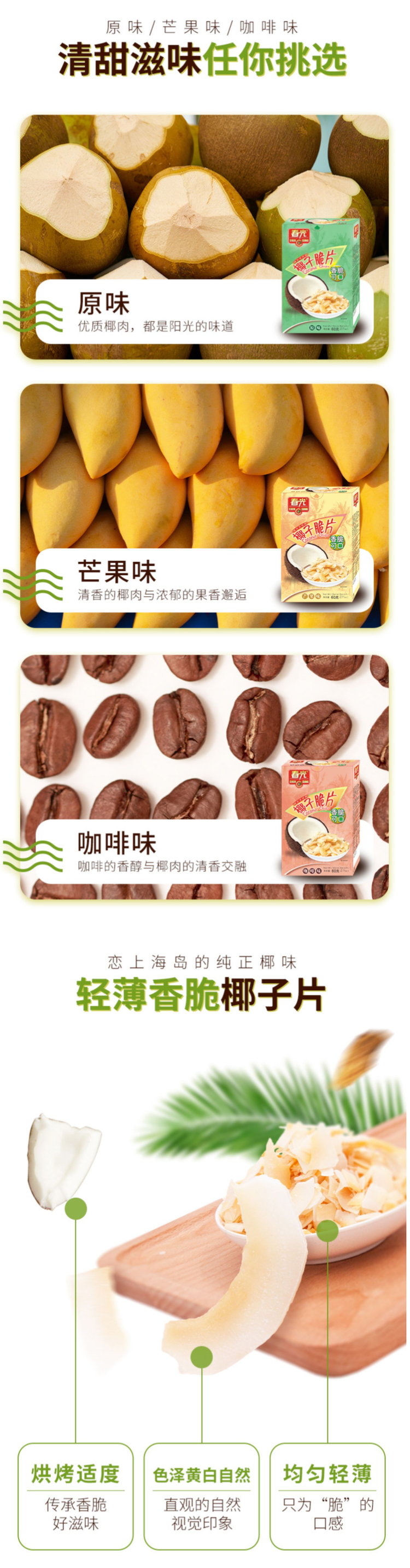 这款春光 烘烤椰子脆片,优选产自文昌东郊椰林的新鲜椰果为原料,经过适度烘烤而成,呈现短条状,色泽黄白自然,椰香四溢,轻薄香脆,入口片片嘎嘣脆,规格是60g*3袋。