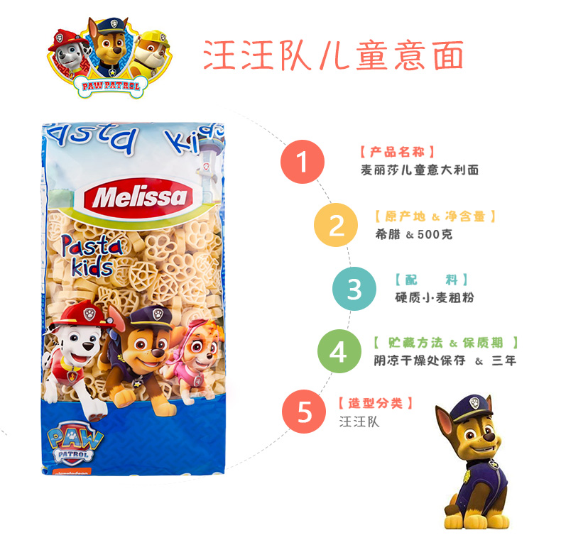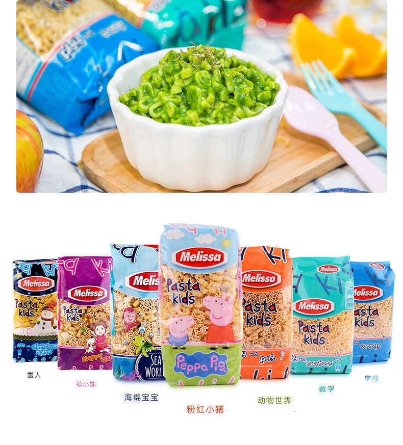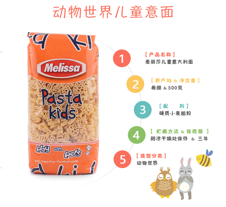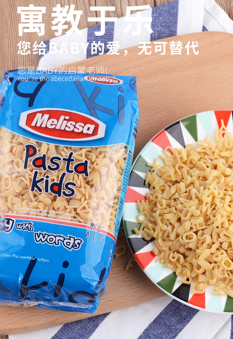 这款麦丽莎意大利面是专为儿童设计,把面条做成卡通造型,希腊原装进口,以杜兰小麦为原料,这个品种属于硬质小麦,具有高密度、高蛋白质、高筋度等特点,做成的意大利面呈金黄色,耐煮、面质软弹,口感劲道爽滑。
