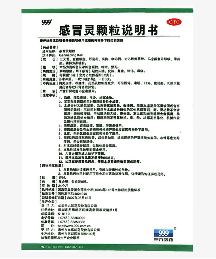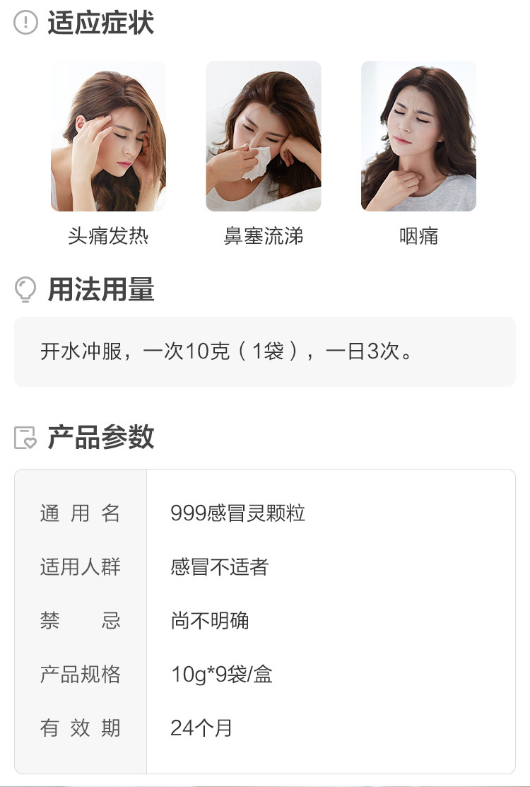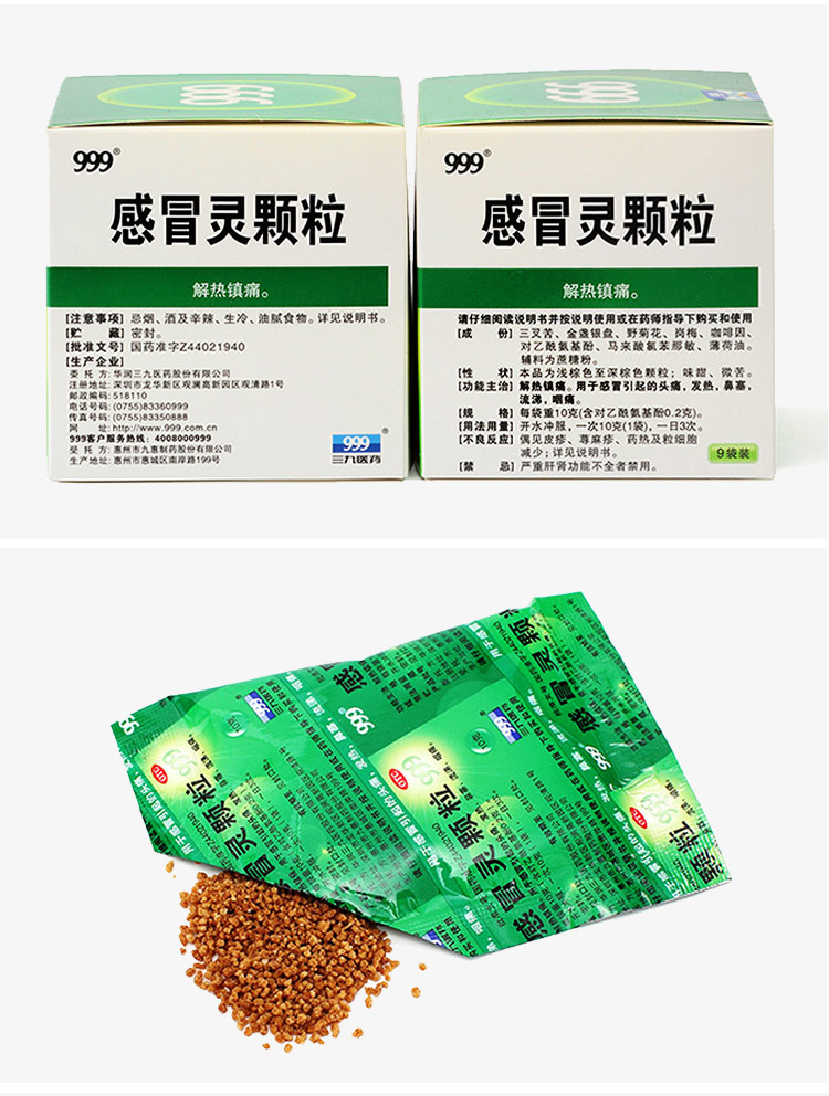 本品为浅棕色至深棕色的颗粒,味甜、微苦。具有解热镇痛功效,用于因感冒引起的头痛,发热,鼻塞,流涕,咽痛等症状。开水冲服,一次1袋,一日3次。小儿减量或遵医嘱。PS:三九感冒灵颗粒是复方药,里面含有中西药成分,不宜和西药感冒药同服。