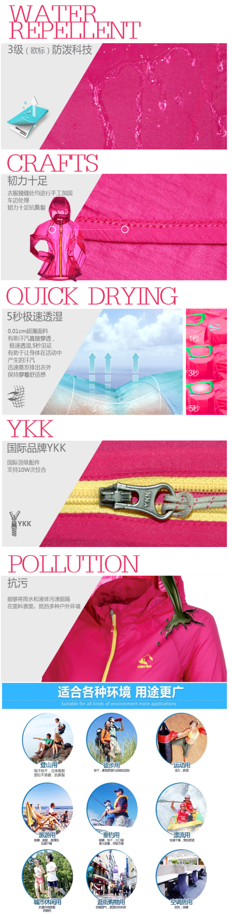 虽然重量轻便,但性能不减,抗撕裂尼龙面料强度好,同时能99%防风,衣面表层还有超级防泼水处理,抵御中小雨完全没问题;双倍透气设计,5秒极速透湿,能快速让衣内汗气迅速排出体外,还有防晒能力。