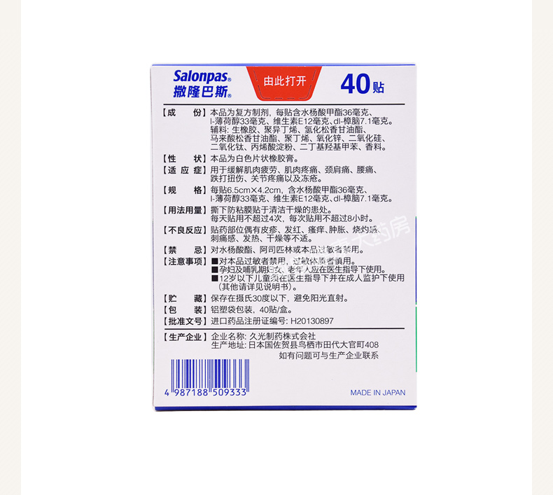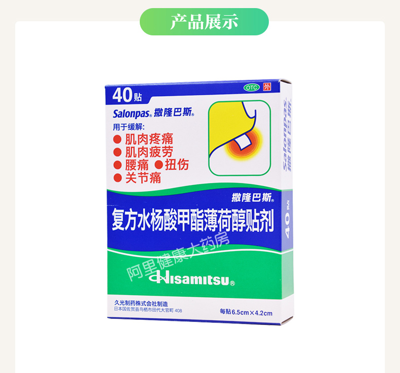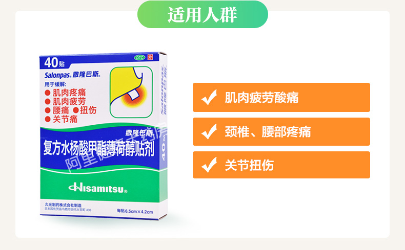共40贴。这款撒隆巴斯 复方水杨酸甲酯薄荷醇贴剂,日本进口,主要治疗肌肉疲劳和疼痛、腰酸背痛、关节扭伤痛,以及跌打风湿引起的各种疼痛等,效力能持续24小时,有效舒缓肌肉劳损及工作引起的各种痛症。