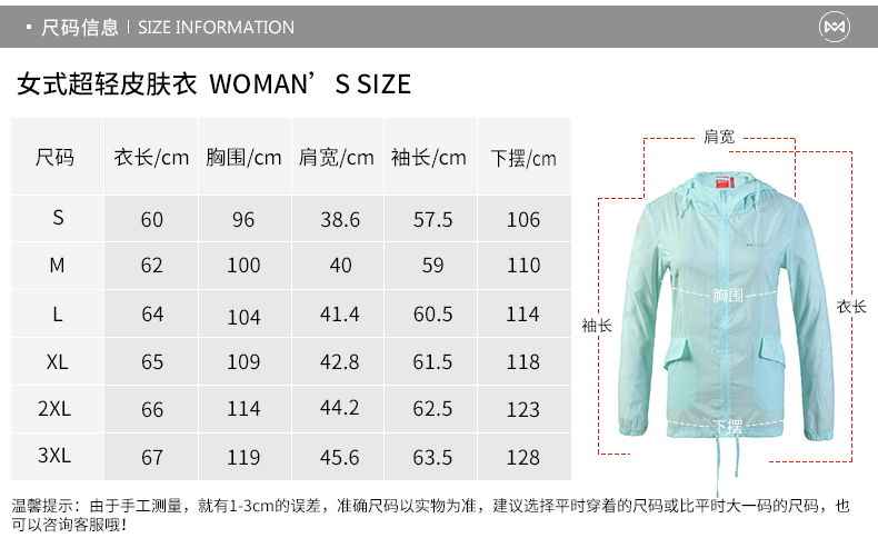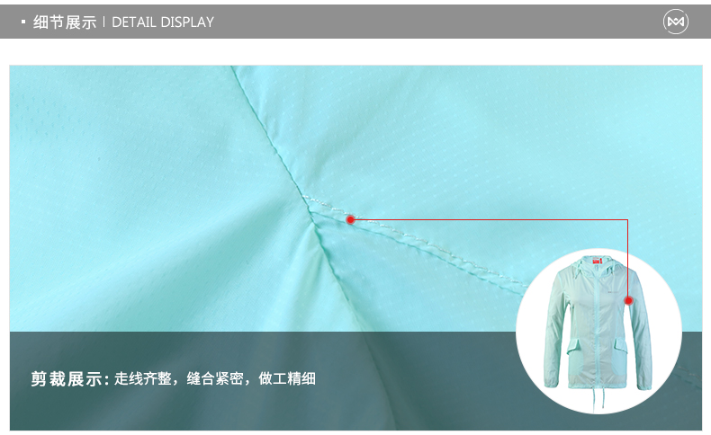 使用100%的抗撕裂尼龙,强度好还能99%防风,可轻度防水,轻薄透气的同时还有不错的防晒能力,更适合夏季穿。