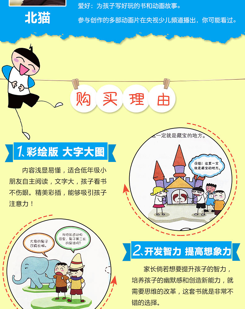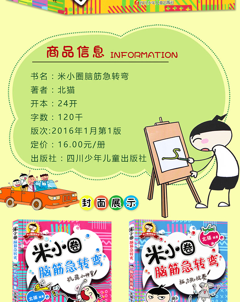 继《米小圈上学记》畅销280万册后,“米小圈”家族又添新成员——调皮可爱的米小圈有故事的《脑筋急转弯》智力大闯关。共包含《脑力挑战赛》、《机灵小神童》、《谁是聪明人》以及《古董大冒险》四本书,彩色幽默漫画,延续“米小圈”系列爆笑风格。便携本,小朋友比较方便携带。每本脑筋急转弯共设置了三关,用一个故事作为主线串联,按照冲关挑战的方式进行。 三关既环环相扣又层层递进,让小读者有体验感、场景感,鼓励小读者在阅读故事的同时,开动脑筋;在开怀大笑之余,拓展思维。