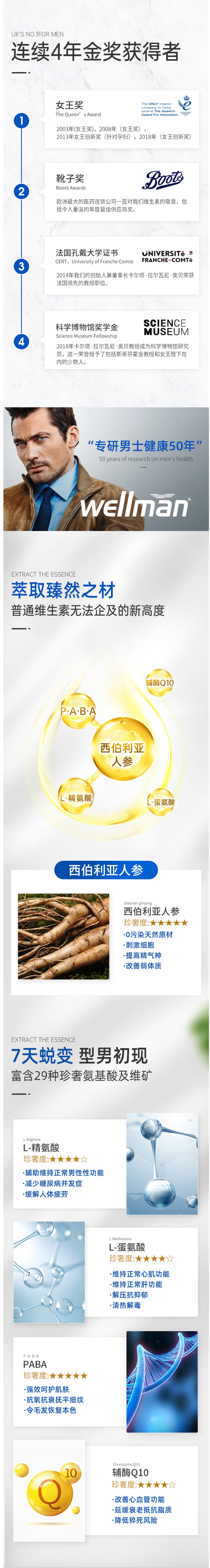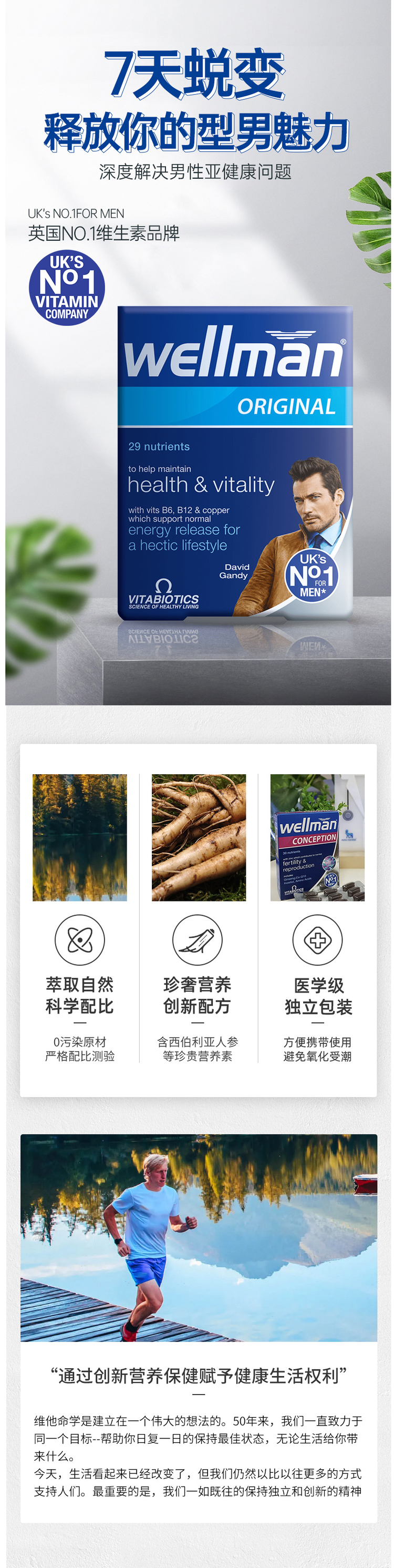 这款维百莱Vitabiotics 男性综合维生素片,英国原产,专为男士设计,从天然物质中提取元素成分,0添加,主要成分是西伯利亚人参和28种氨基酸及维矿营养,包括富含维生素A、B、C、D、T镁、铁、锌、辅酶Q10等多种维生素。