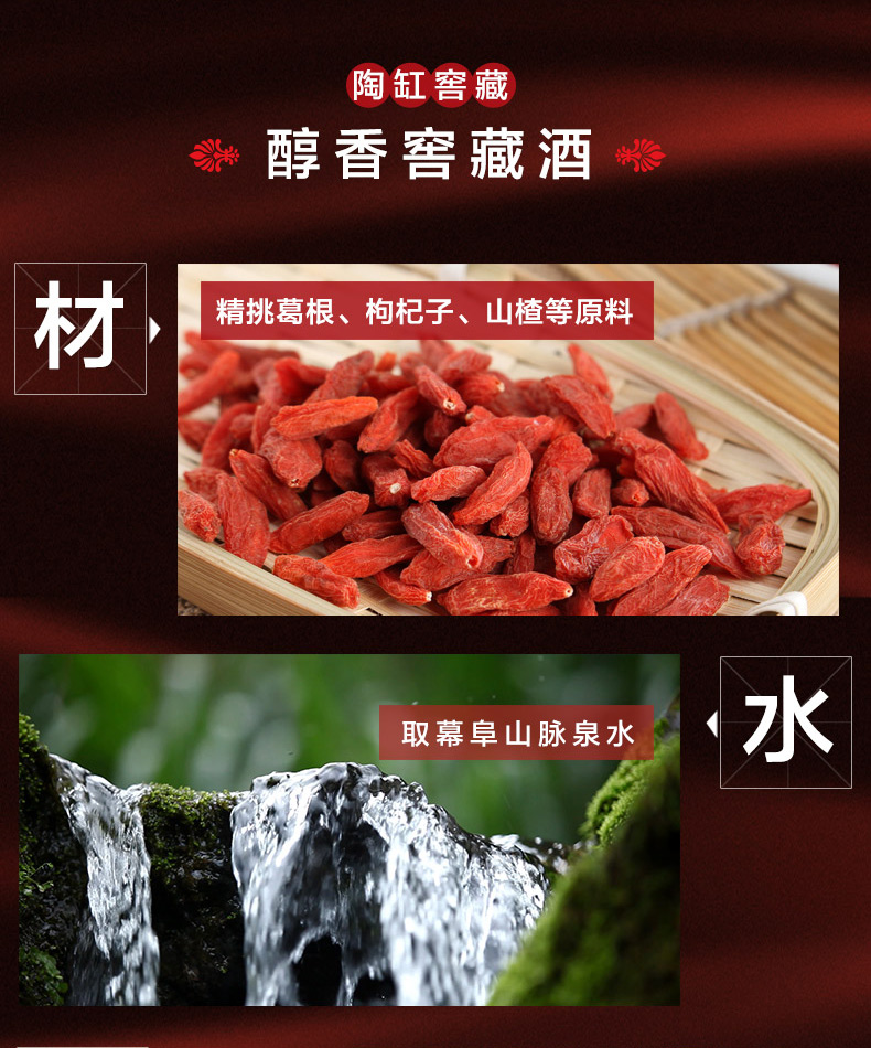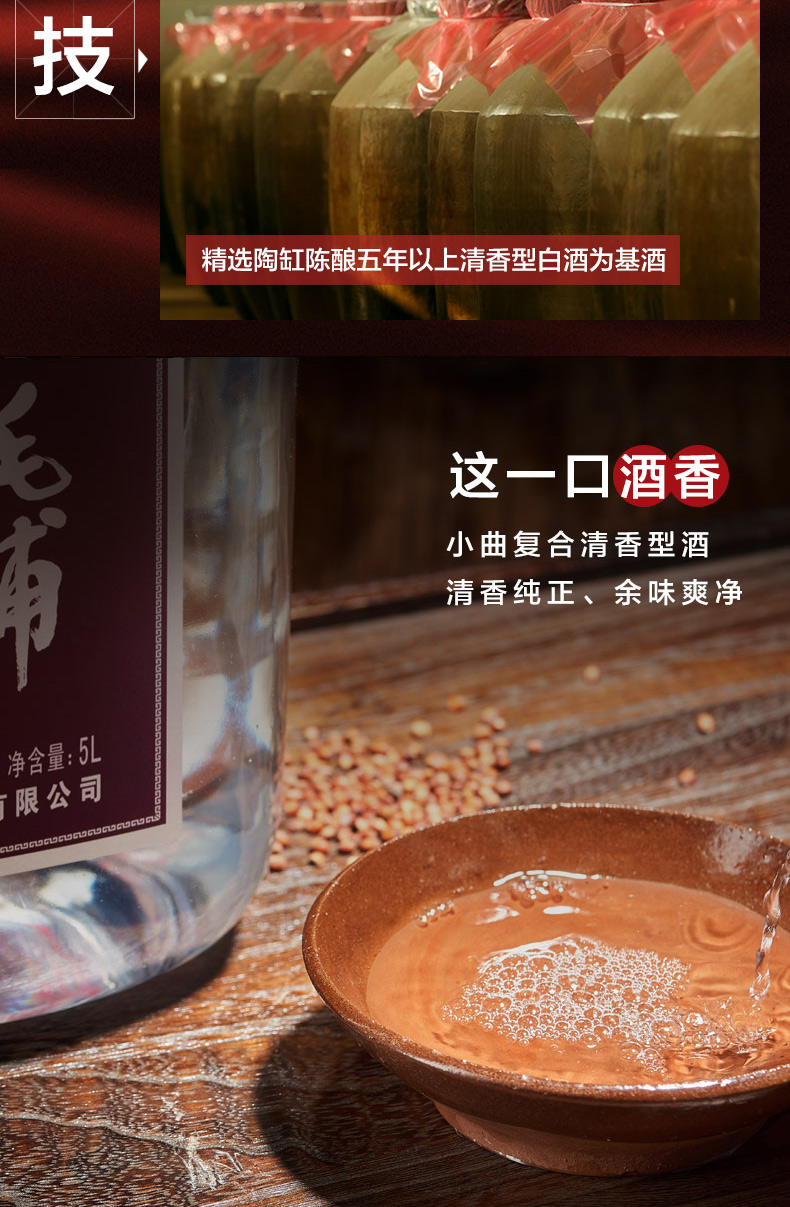 这款毛铺窖酒,精选阜山山泉水酿造的,窖藏5年以上的清香型白酒为基酒,搭配葛根、枸杞子、山楂的食药同源保健药材,清香纯正,余味爽净,具有浓郁的复合型清香香味。