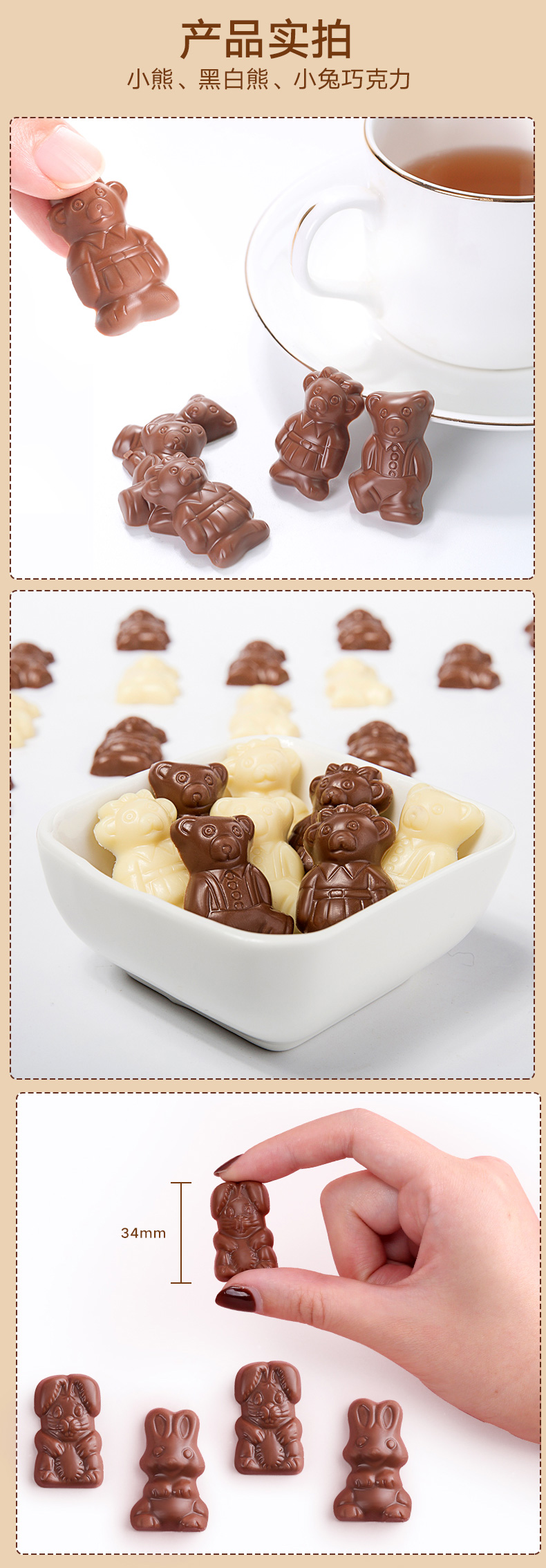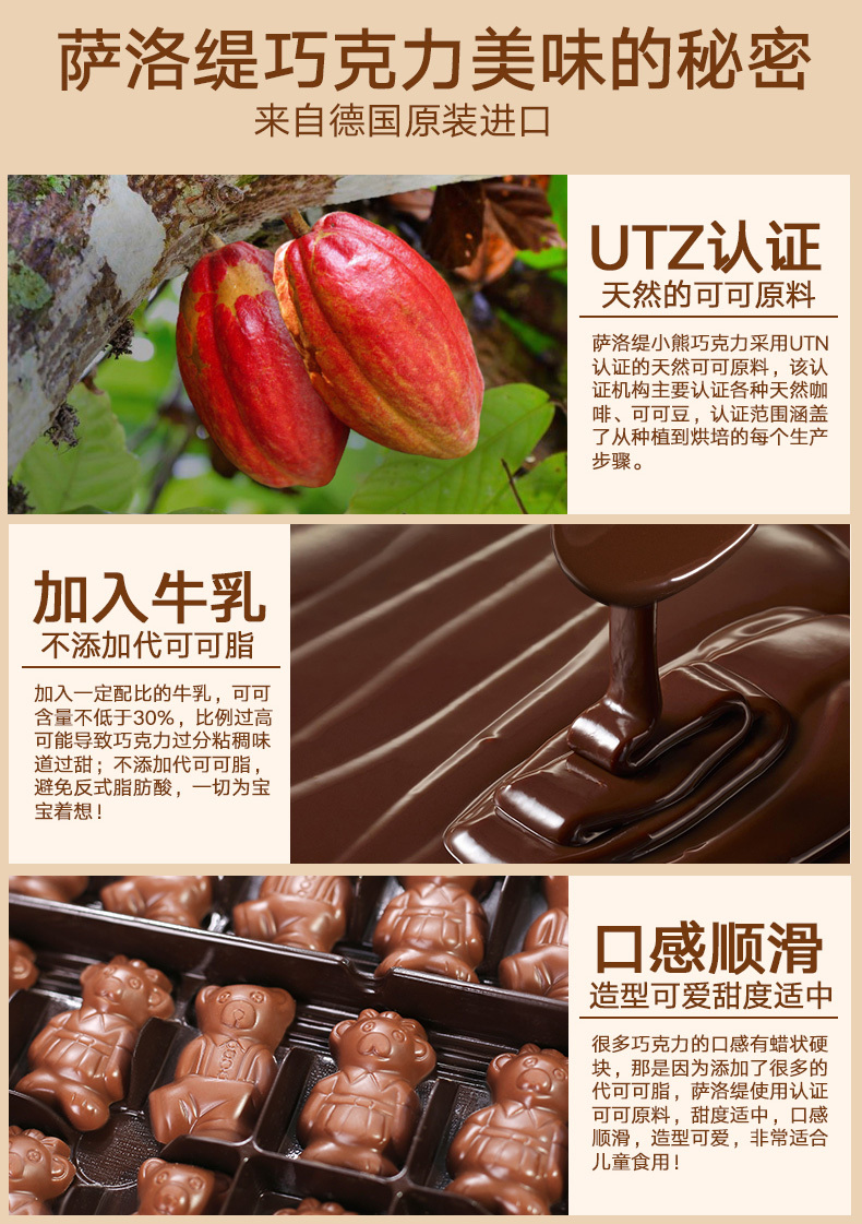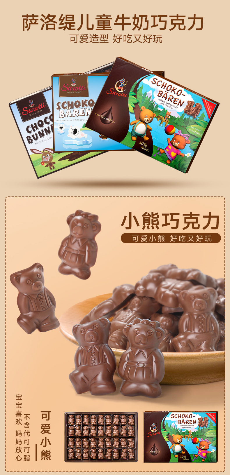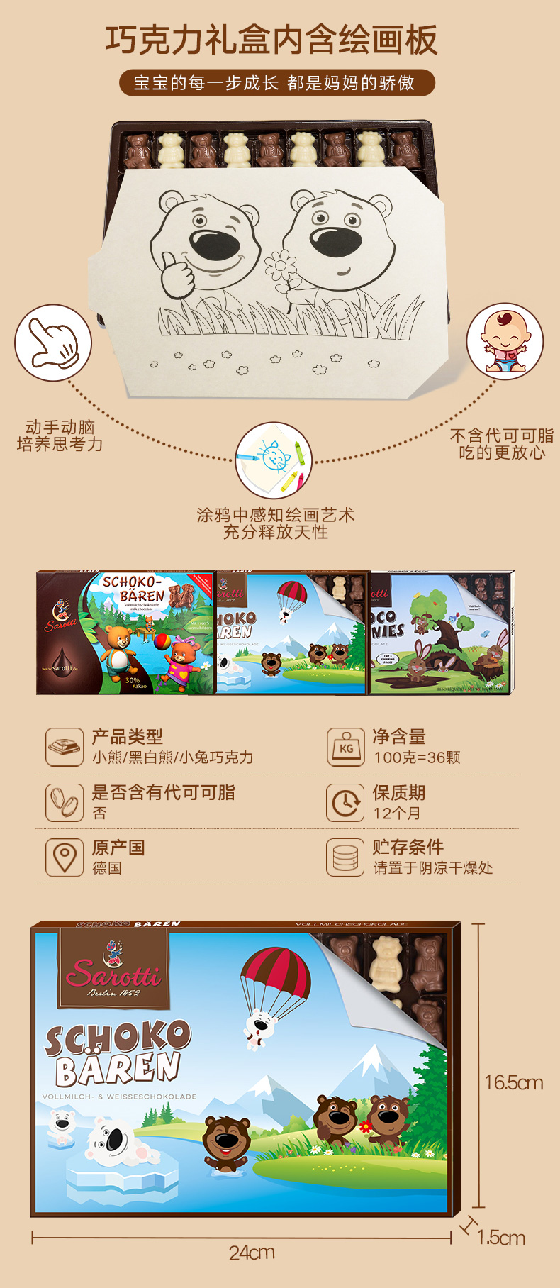 这款萨洛缇Sarotti儿童小熊牛奶巧克力,德国原装进口,保证品质,独特卡通小熊造型,每盒36个,一口一个,入口即化,内里有密封薄膜,不易损坏;含30%的可可含量,不伤健康,封盖背面是卡通熊的绘画板,给孩子一个惊喜。