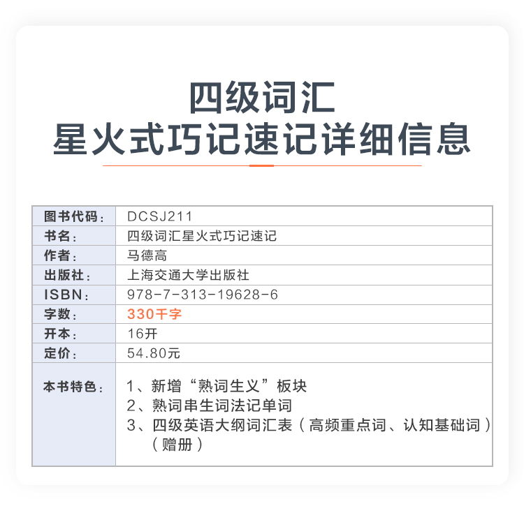 天猫星火图书旗舰店0元,可领20元优惠券,实付15.8元到手,是正价54.8元的2.9折;专注英语考试25年,星火式速记四级词汇,通过联想记忆快速增加词汇量,图文并茂,易懂易记,有了它,四级词汇轻松记,退货运费险领券链接点此