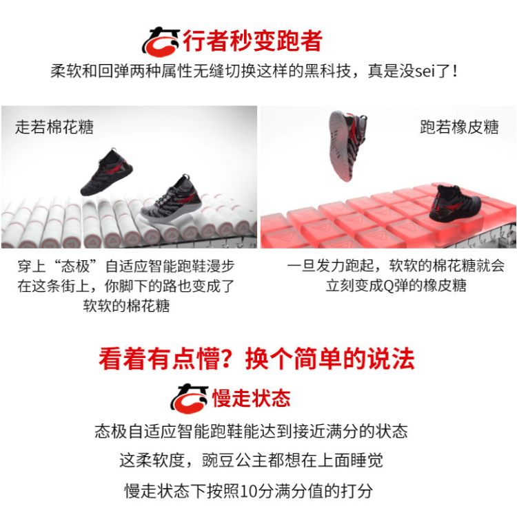 态极的核心就是中底,而中底是使用一种类似于非牛顿流体的物质发泡制成,能做到“遇硬则硬,遇软则软”的效果,在慢走状态下的柔软度微微次于加厚的记忆棉材质,在快速跑动中能获得比Boost颗粒更大的回弹感觉,在发布会上还上演了一幕“铅球变篮球”的好戏。
