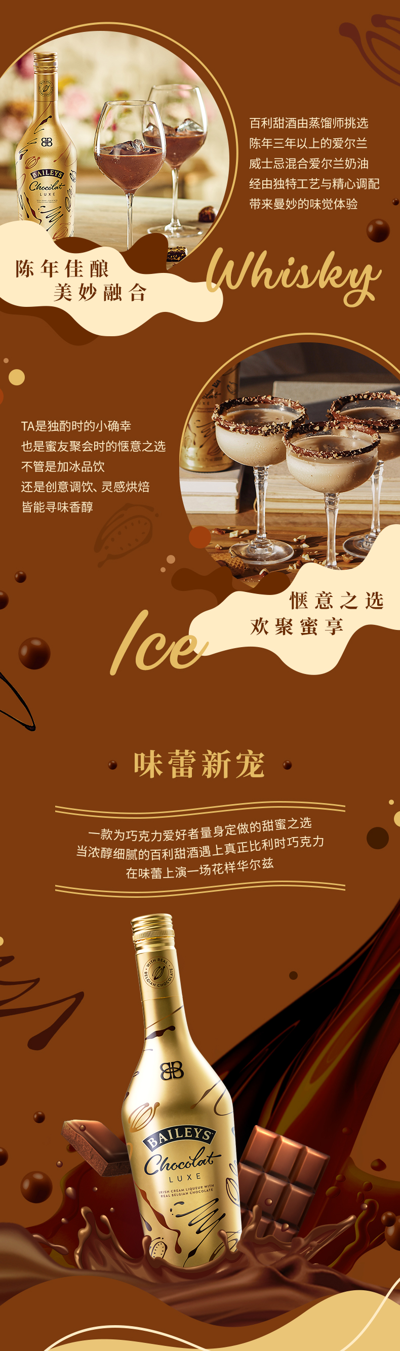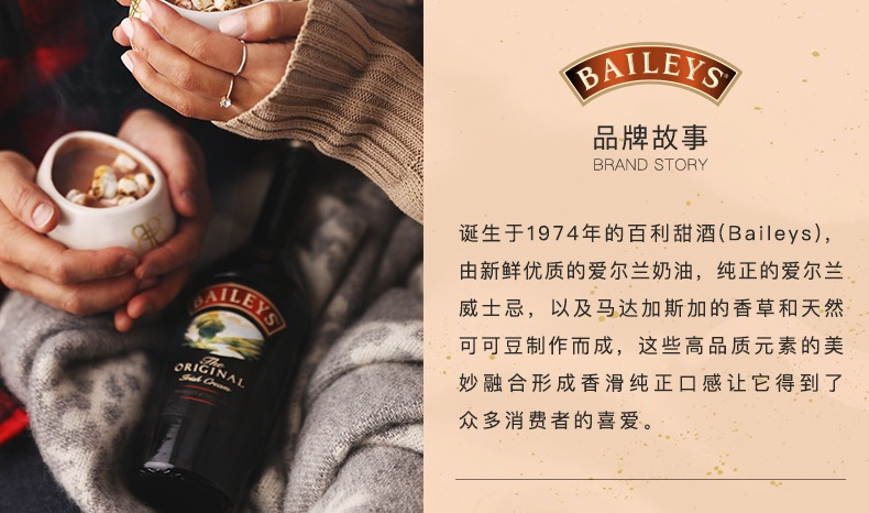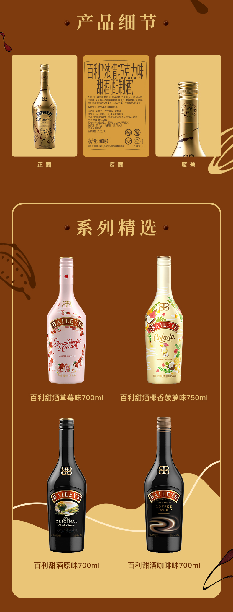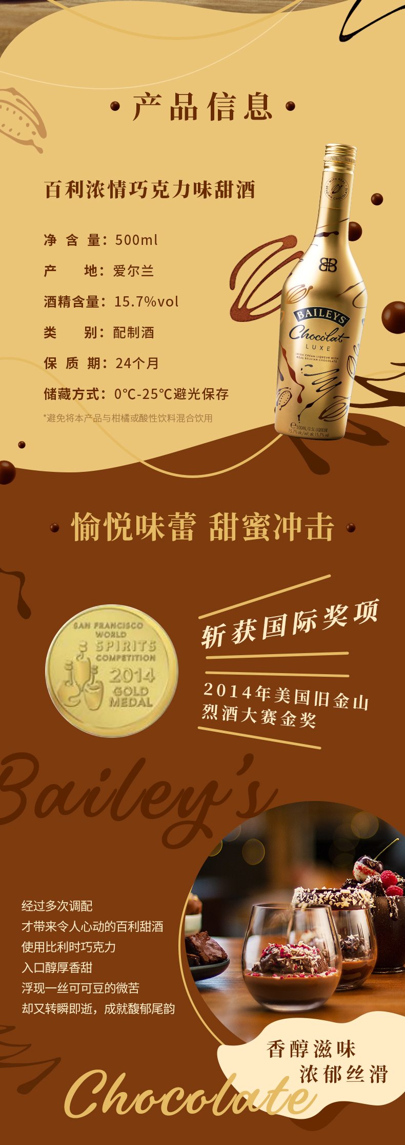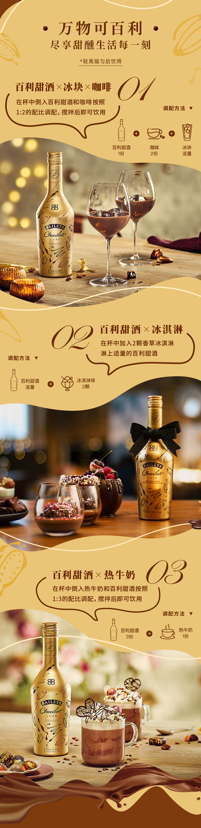 这款百利甜酒由新鲜的爱尔兰奶油、纯正的爱尔兰威士忌、各种天然香料、巧克力以及爱尔兰精酿烈酒调配而成,口感馥郁香甜,可用来搭配各种甜点、冰淇淋等,美味更增。