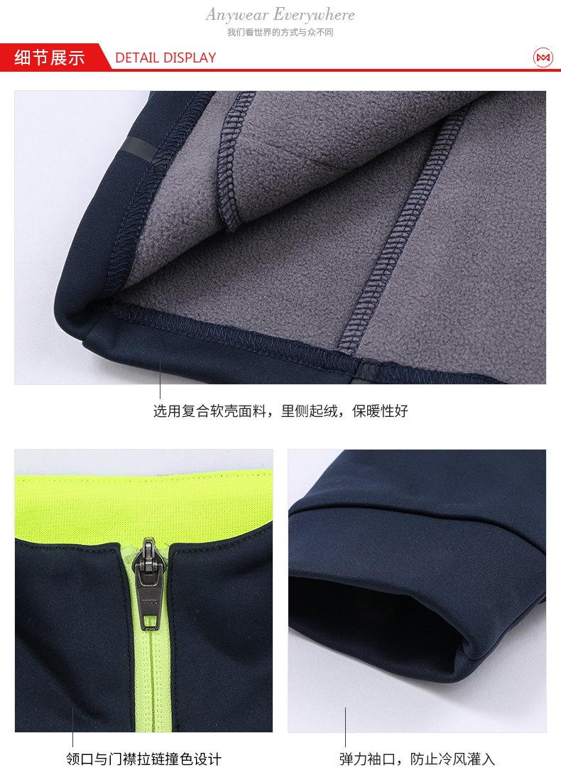 在款式和细节上,合身版型上身不拖沓,领口内和拉链是撞色设计,时尚前卫。弹力袖口,防止冷风灌入。口袋拉链彩膜装饰,提升拉链牢固度,同时不易进水