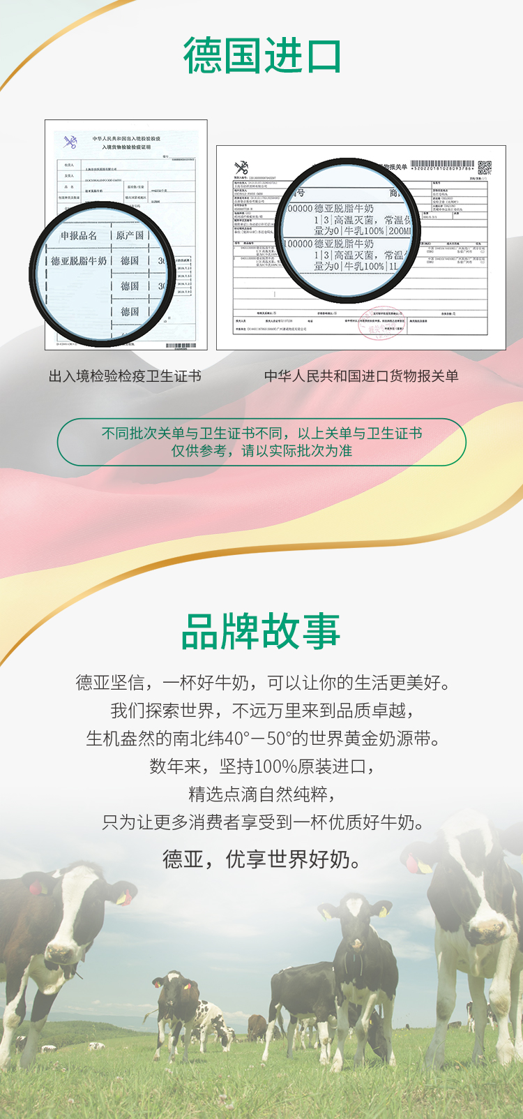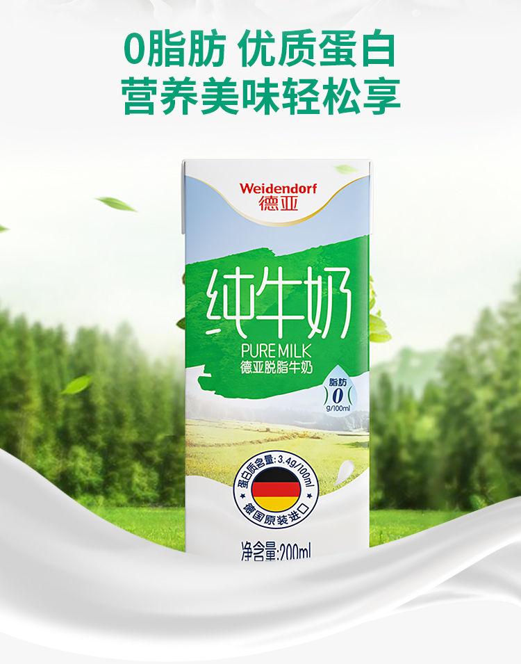 Weidendorf德亚是品利公司的自有品牌,是一家正规的进口食品进口商和经销商,其奶源采自澳大利亚和德国两地。德亚牛奶由德国知名奶产品厂商Hochwald 好沃德代工生产,商品拥有国家颁发的“出入境检验检疫卫生证书”和“中国人民共和国进口货物报关单”。