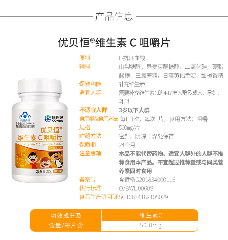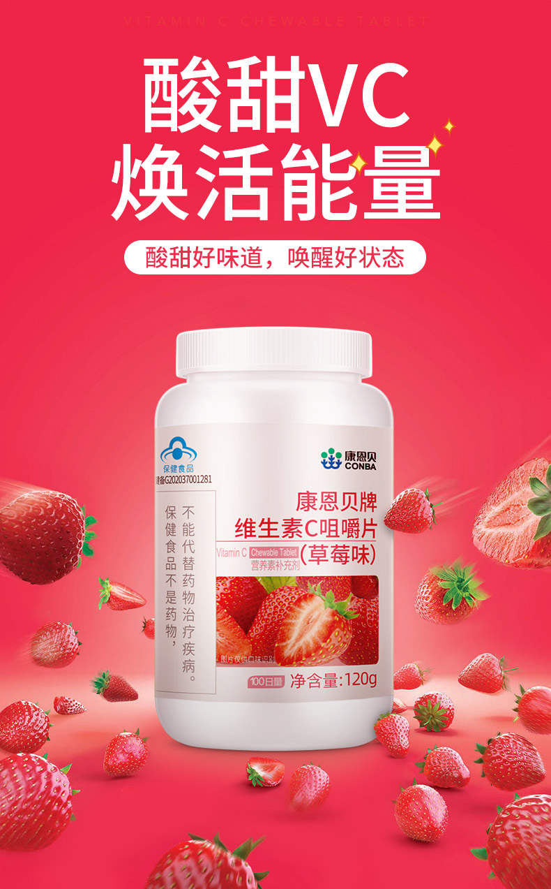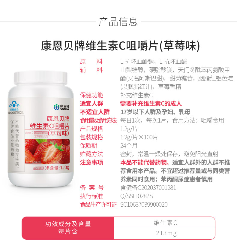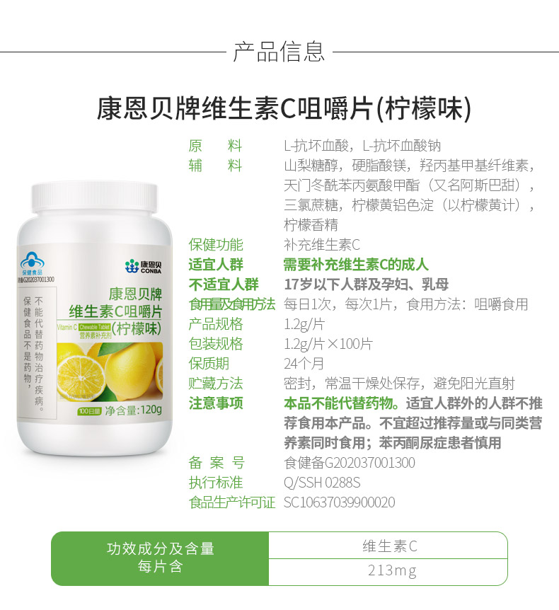 这款康恩贝 维生素C咀嚼片,每片当中有维生素C 213mg,适合经常运动、骨骼牙齿不健康、体质弱、长期抽烟喝酒等人群。不适宜婴幼儿、少年儿童、孕妇、乳母,每日1次,每次1片,咀嚼食用。