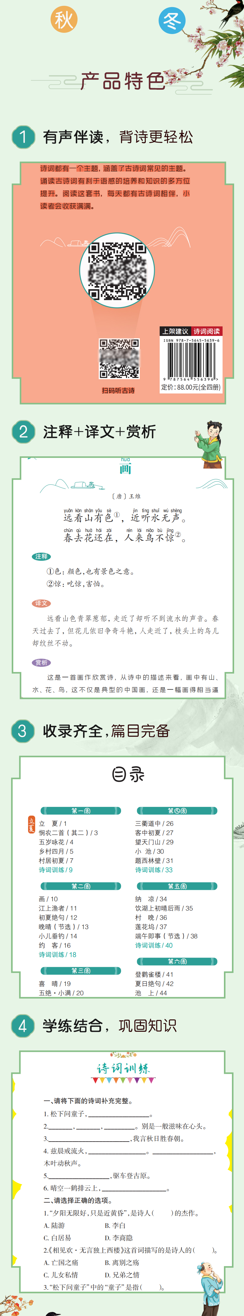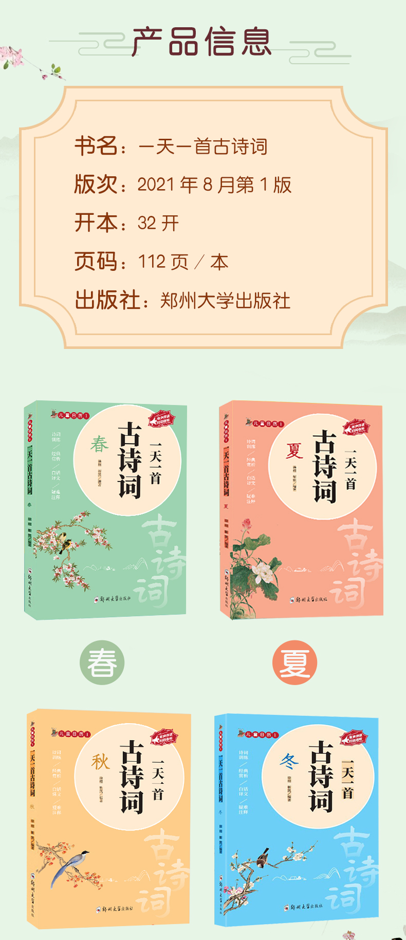 天猫日升图书专营店22.8元,可领10元优惠券,实付12.8元到手,是正价88元的1.5折;孩子一生必读的古诗词书,全套4册,注音版,春夏秋冬一天一首古诗词,还是有声伴读的哦!全文注释译文,无障碍阅读,还有练习,学练结合,让孩子多读古诗词,提高语文水平领券链接点此