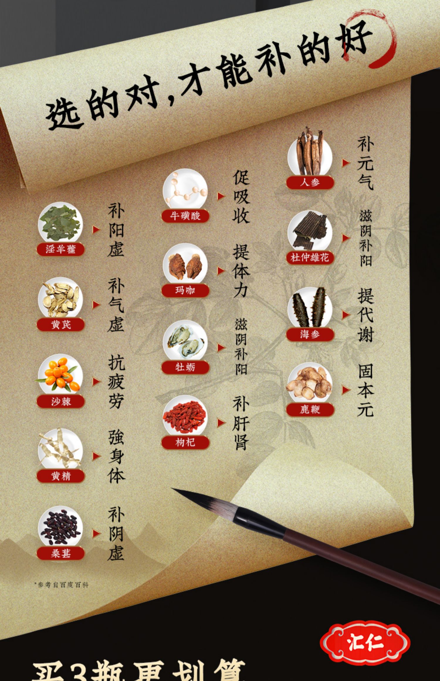 天猫汇仁保健食品旗舰店229元,可领210元优惠券,实付19元到手,汇仁今年新款的海参片,甘肃、吉林、河南3处自有药田,优选淫羊藿、黄精、玛咖、人参、杜仲雄花、海参、鹿鞭等13味天然野生药材,经过81天11道工序慢熬而成,一瓶就见效,3瓶重拾硬汉能量。