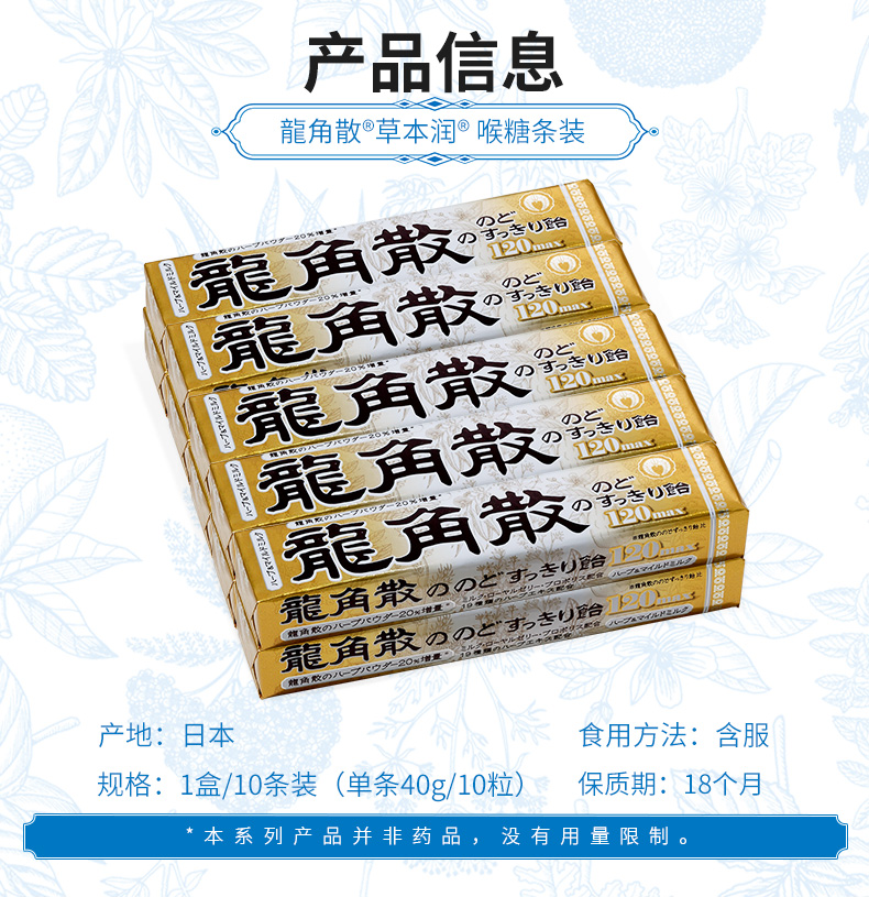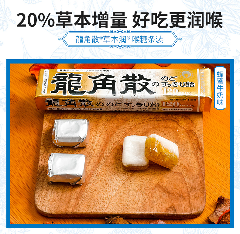 特别的龙角散生药配合,100微米细的龙角散粉末包覆于润喉糖的中心,瞬间滋润不适喉咙,对于除痰止咳,清肺、痰多,咽喉肿痛、咽喉炎症有一定的功效,特别是换季的时候,早晚温差大,容易引起长久的干咳和痰咳,家中常备药品,3岁以上宝宝都可以吃。