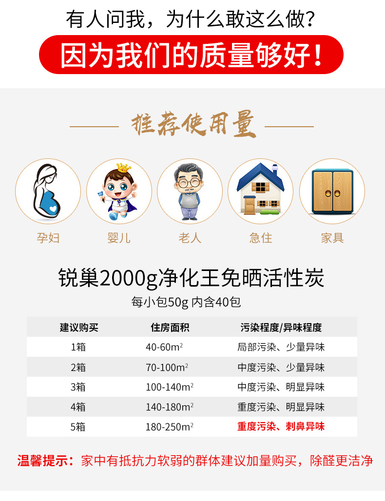 这款锐巢活性炭包,可主动锁定空气中的有害气体,碳表面会快速吸附甲醛分子加速甲醛分解,最后分解为二氧化碳和水。有效减少空气的有害气体。也可以放置在汽车内、卫浴等地,吸湿除味,净化空气。