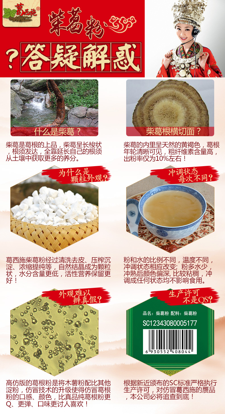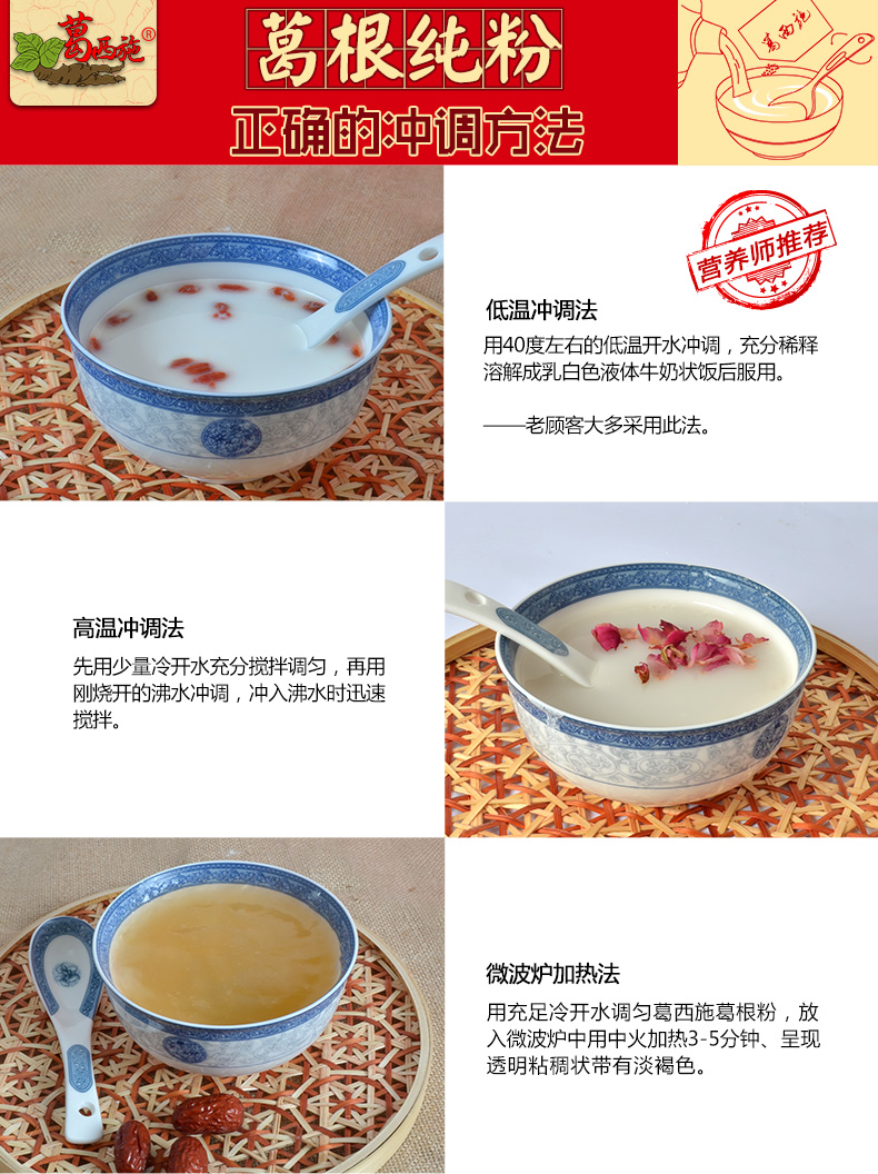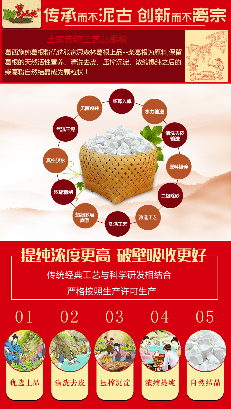这款葛西施 纯野生葛根粉,产地是张家界,以天然野生纯葛根为原料,运用现代超微粉碎和破壁工艺提纯,在制作过程中不添加木薯粉、芳香剂、清凉剂、增稠剂,同时经过细胞破壁的葛根粉,具有良好的溶解性、易吸收性的优点,可以实现缓释吸收、高效利用的目的。