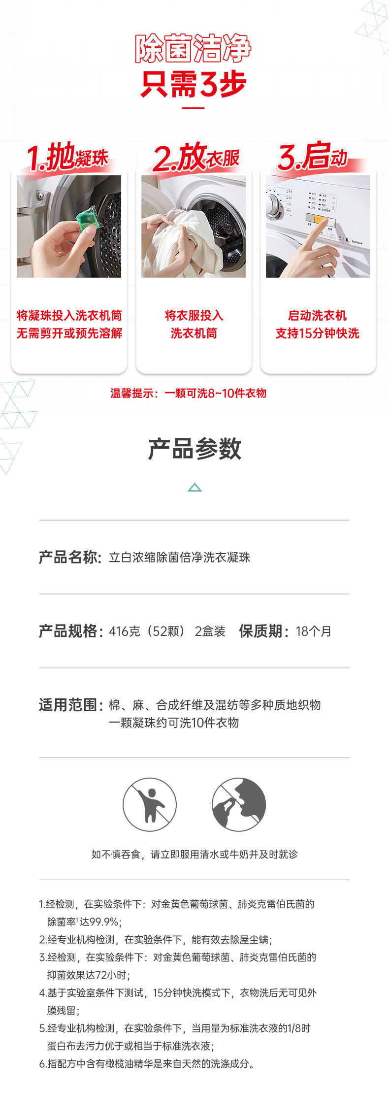 99.9%除菌率 72小时长效抑菌 8倍洁净力。一颗洗一桶比买洗衣液还划算,8倍清洁力一盒可洗500件。