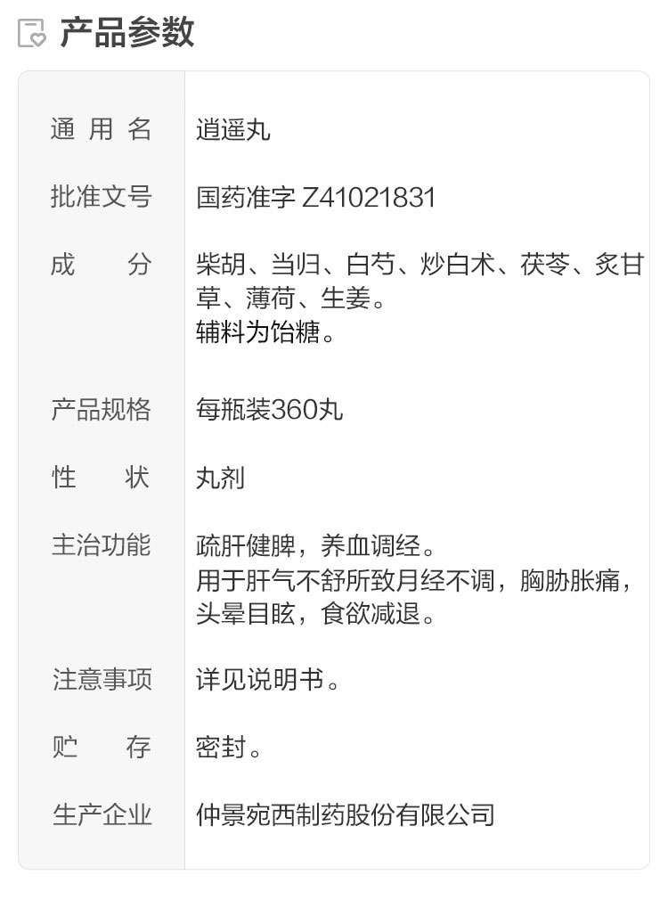 这款仲景 逍遥丸,主要成分是柴胡、当归、白芍、炒白术、茯苓、炙甘草、薄荷、生姜,辅料为饴糖,能疏肝健脾,养血调经,用于肝气不舒所导致的月经不调,胸肋肿痛,头晕目眩,食欲减退。
