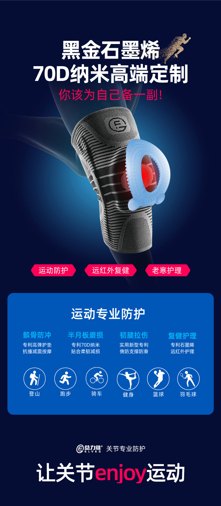 这款益力维 石墨烯远红外护膝 ,拥有四项专利认证,高端定制,选用新型石墨烯纳米材料,高密度三维编织技术,选用石墨烯70D超细长丝双编,柔软舒适,高强度高弹力,整体受力均匀,不分层,增强关节屈伸稳定性及韧带肌腱保护,护膝纱线中富含负离子远红外,可以促进循环,排酸减疲,驱寒除湿等,养护关节;