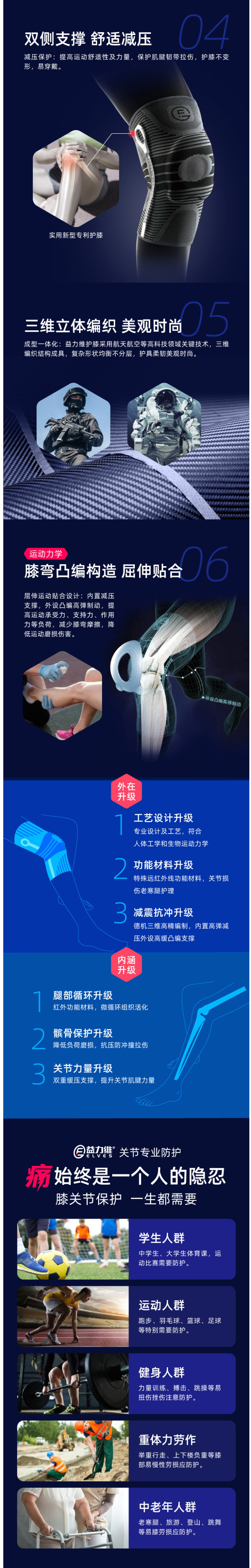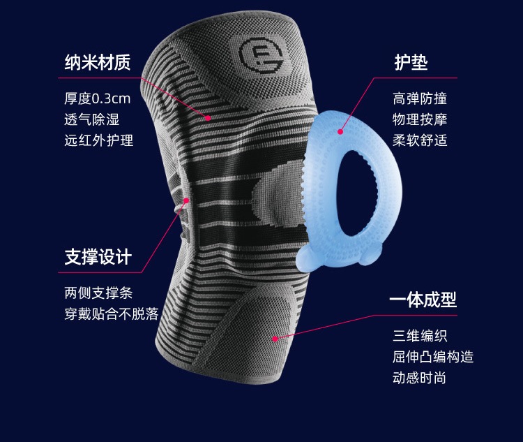 专利高弹高缓冲髌骨衬垫,保护半月板,抗冲击抗压力,减缓膝关节运动磨损,更舒适;两侧韧带肌腱支撑条,防滑减压,提高运动中的侧防能力,保护腿部肌腱韧带,减少运动损伤。