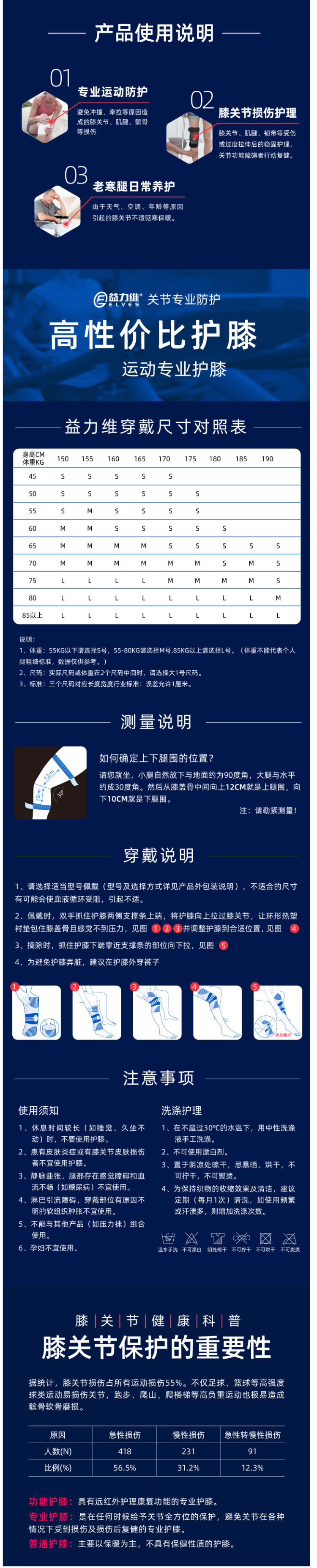 美国FDA标准,专业运动防护,适合关节损伤复健、重体力劳作防护、运动健身防护等。这款护膝髌骨部分采用高弹热塑衬垫,减震抗冲击,两侧韧带高弹支撑条,避免韧带损伤,远红外负离子有益关节,老寒腿保养等。