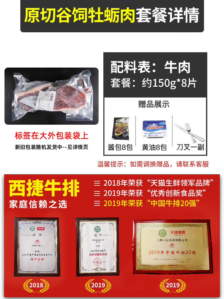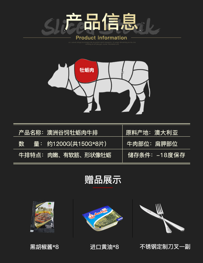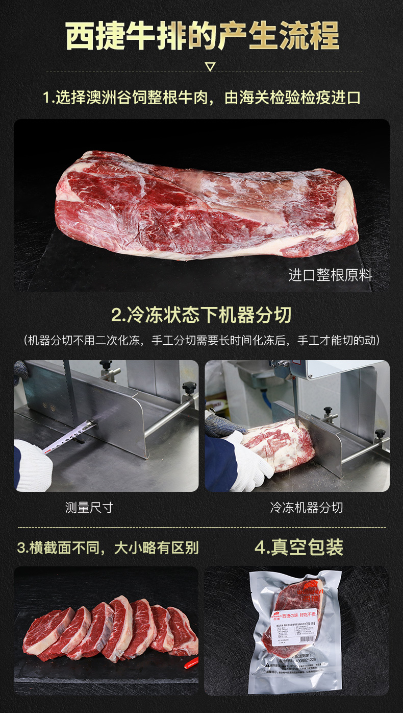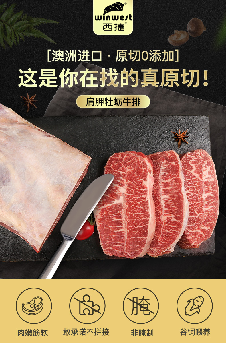 这款西捷牛排,澳洲正规进口可溯源,选用谷饲100天以上牛的肩胛部位,整块原切非腌制,这个部位肉质油花丰富,中间带有明显一条软筋,因形似“牡蛎肉”而得名,因少有活动所以肉质细嫩,肥瘦相间,雪花纹理清晰,口感超细嫩,0添加,老少皆宜,适合煎、炒、烤等~~。