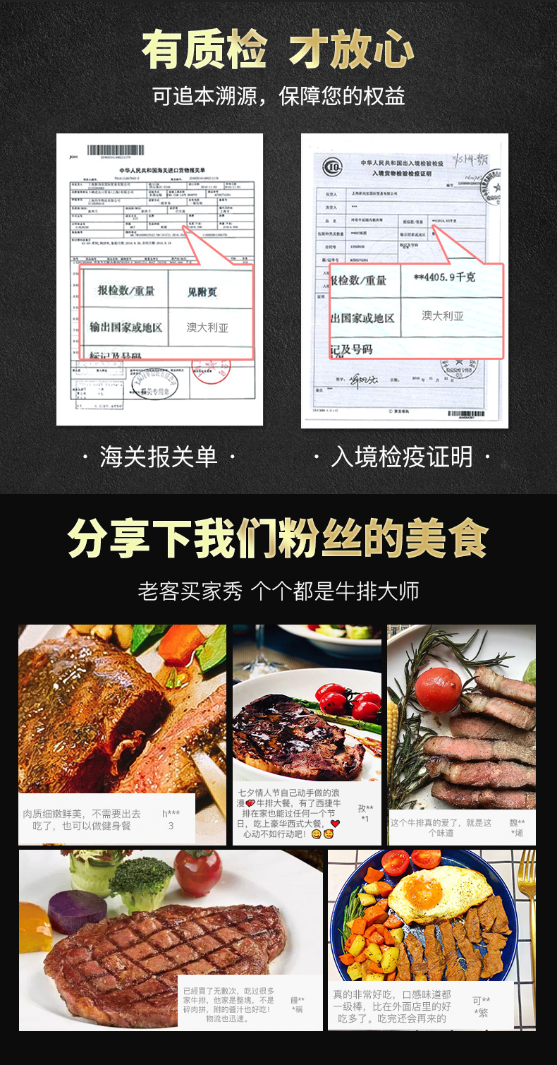 买牛排认准「原切」+「非腌制」,是最好也是最贵的牛排,如果看到配料含“卡拉胶”和“大豆分离蛋白”的牛排,都不建议大家购买。