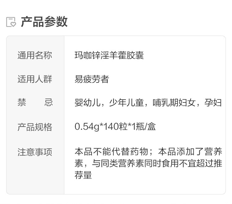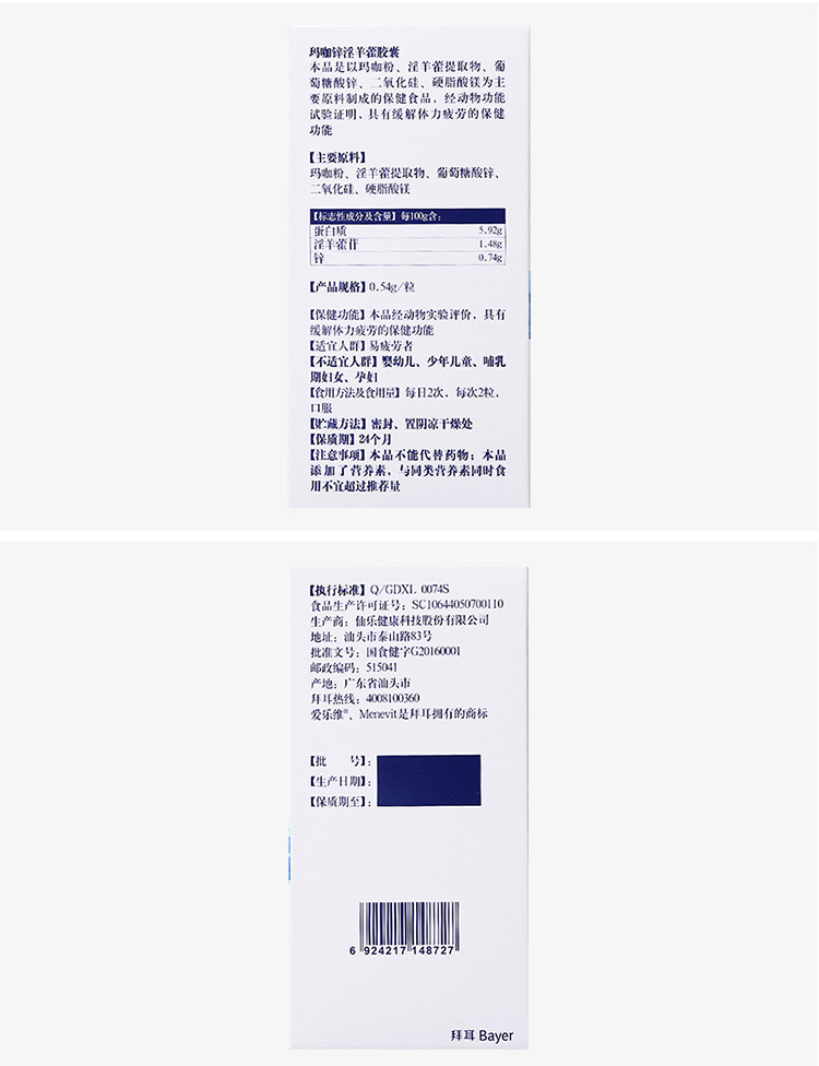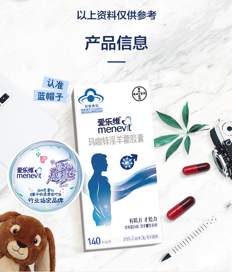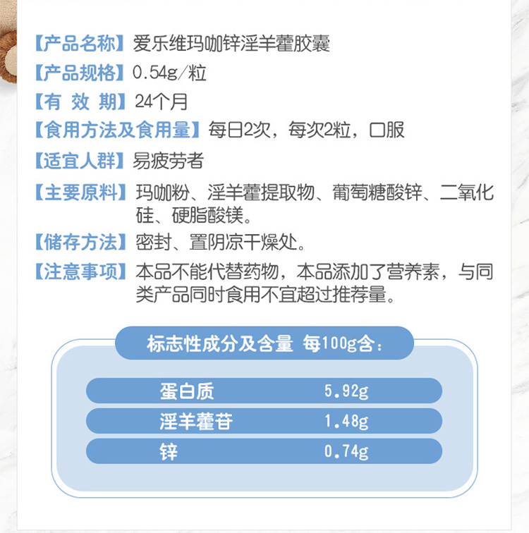 这款爱尔维玛咖锌淫羊藿胶囊是专为男性设计,是以玛咖粉、淫羊藿提取物、葡萄糖酸锌、二氧化硅为主要原料制成的保健品,具有缓解体力疲劳,提高精子活力的效果。规格是140粒/瓶,用法用量:1日2次,1次2片。