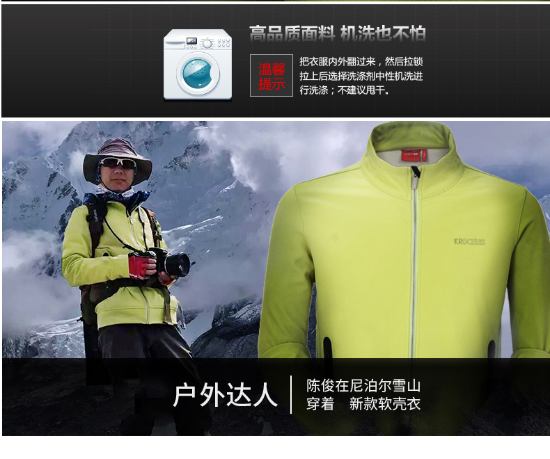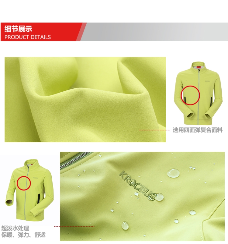地球科学家这款软壳夹克,特点是高弹力和拒水。单层双面,外层是梭织的软壳面料,可达97%防风,里面是保暖的抓绒,一般软壳夹克都带横向弹力,氨纶弹力纤维含量在10%,这款含量在16.6%,带四向弹力,比运动服还活动自如,抗皱好打理。
