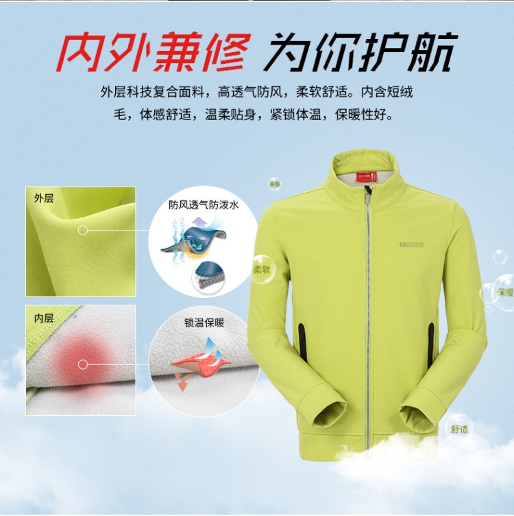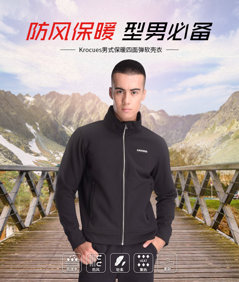 软壳防风的同时,使用柔软有弹力面料,舒适度接近日常衣物,和一般运动装差不多。相比平常衣物,软壳的防护功能非常的实用,对付平常大风小雨足以,适合日常穿着。很多软壳的里层,带有不同厚度的抓绒,抓绒的保暖效果和羊绒一样好,这种带绒面的软壳保暖也非常好。