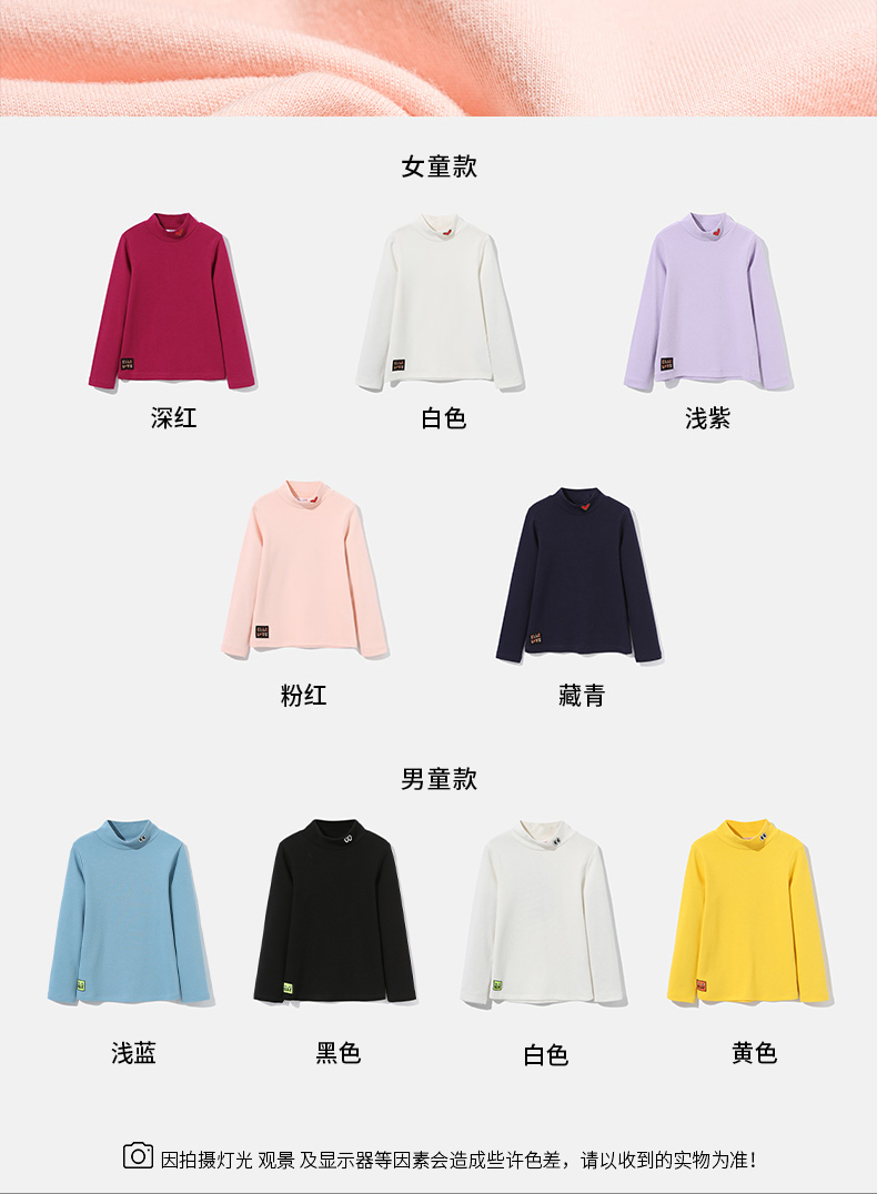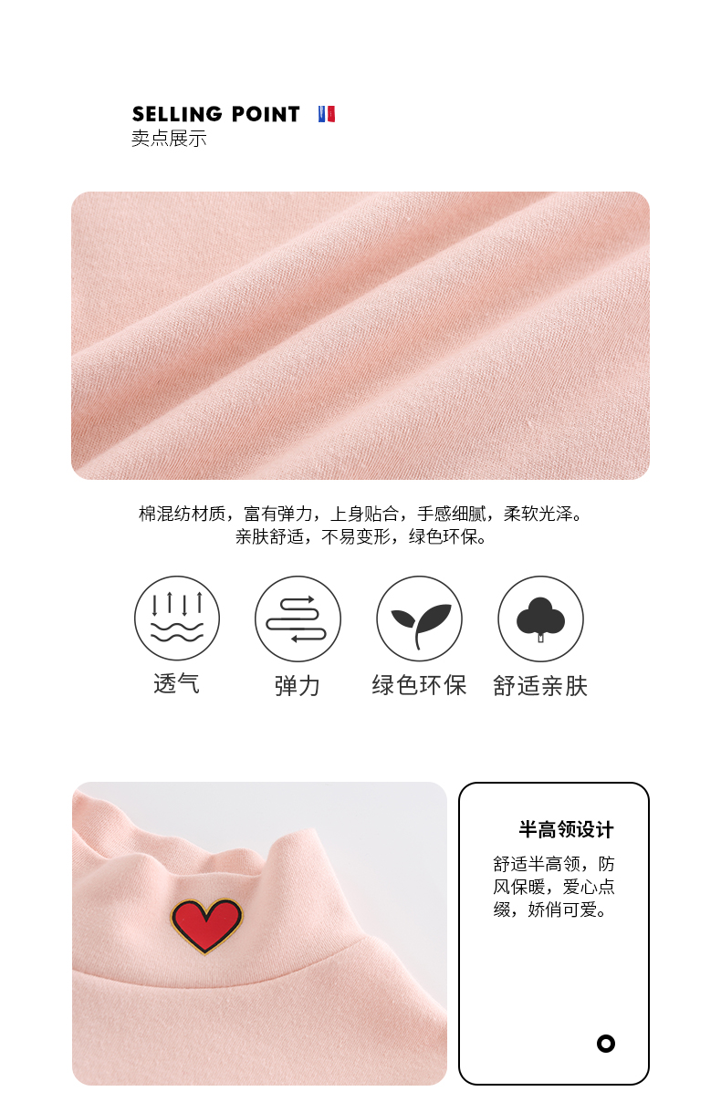这款ELLE kids 男女童半高领打底衫,棉混纺材质,上身贴合,手感细腻,柔软光泽,亲肤舒适,不易变形,绿色环保;舒适半高领,防风保暖,爱心点缀,娇俏可爱;卡通贴布装饰,增添童趣,点睛亮眼。