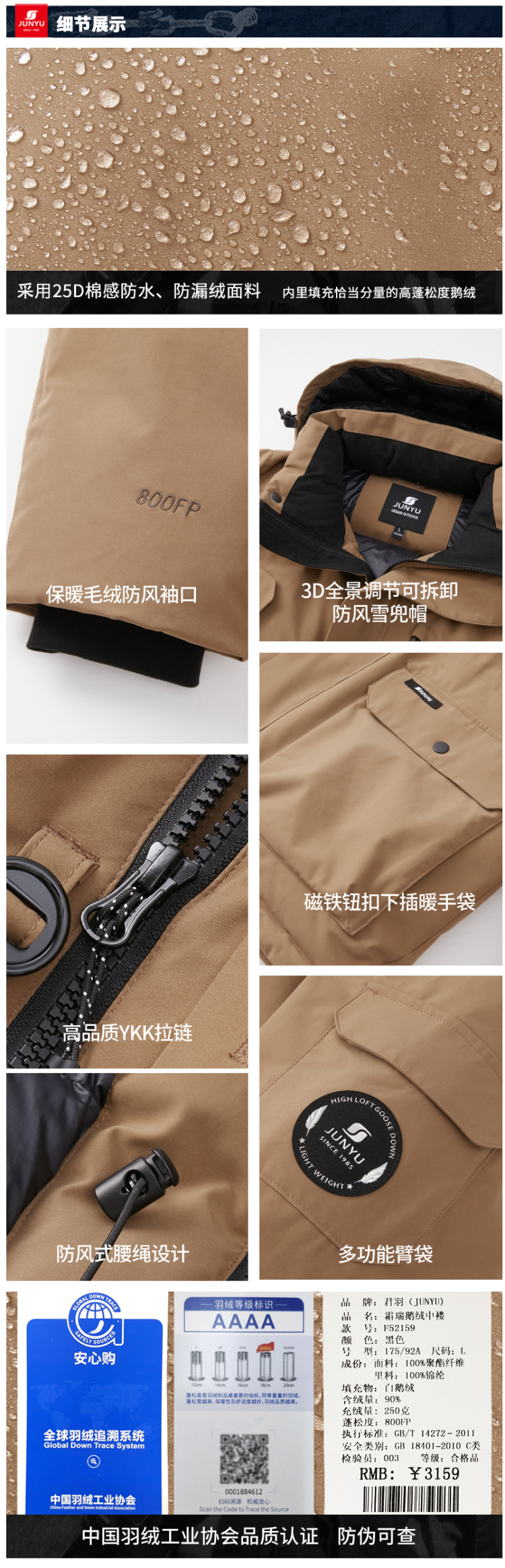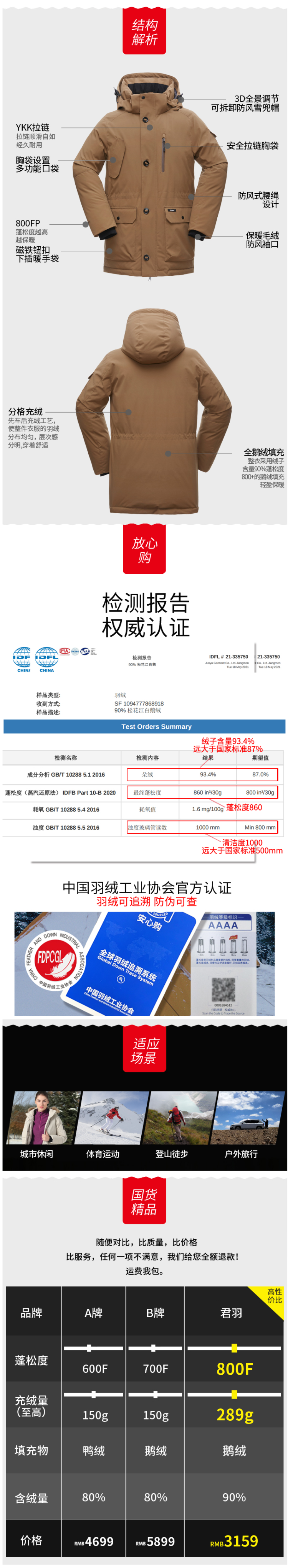 这款君羽霜瑞男羽绒服,属于君羽的酷寒系列,填充800蓬90%的鹅绒,L码充绒量为250克,外层是防风防雪耐磨压胶面料—50D超高弹平纹防绒布,防水值达5千,能有效防风雨雪还耐磨。
