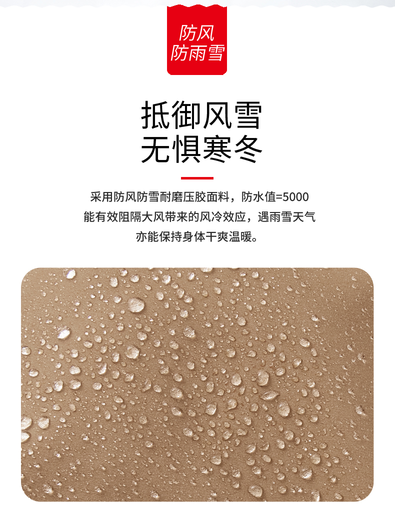 内层是20D石墨烯抗静电锦纶,能挡风防漏绒,内置式保暖毛绒防风袖口,可抗零下15~30℃的寒冷。