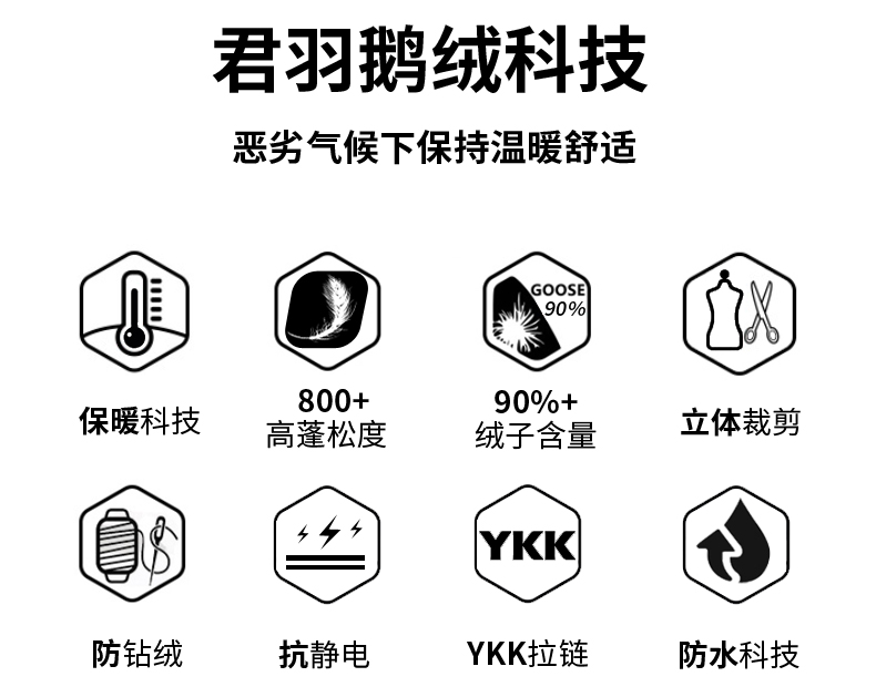 「鹅绒」800蓬鹅绒成本约是普通鸭绒的10倍,没有鸭毛的腥味,保暖效果更好:「250克 800蓬鹅绒」≈「324克 700蓬普通鹅绒」≈「642克普通鸭绒」,可以穿的又轻又暖。
