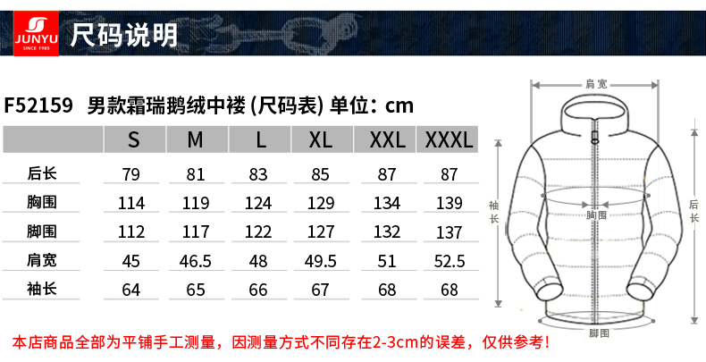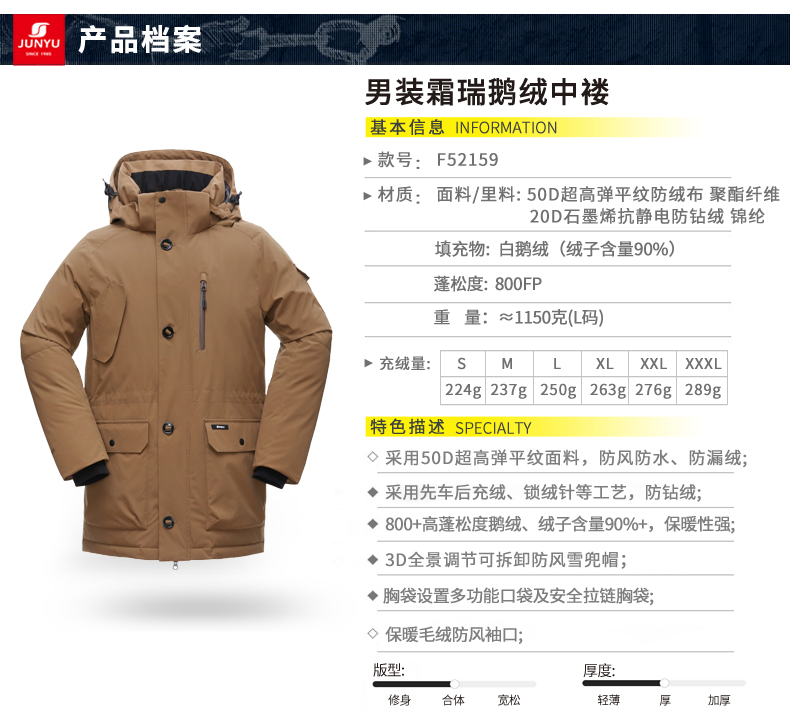 具体充绒:S码 224g、M码 237g、L码 250g、XL码 263g、XXL码 276g、XXL码 289g