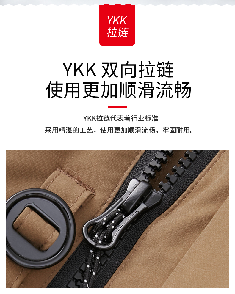 胸前设置多功能口袋和安全拉链胸袋;袖口是防风的,还内置有保暖毛绒;主拉链和口袋拉链都是YKK的,胸前是双向拉链,带双门襟,防护效果更好。