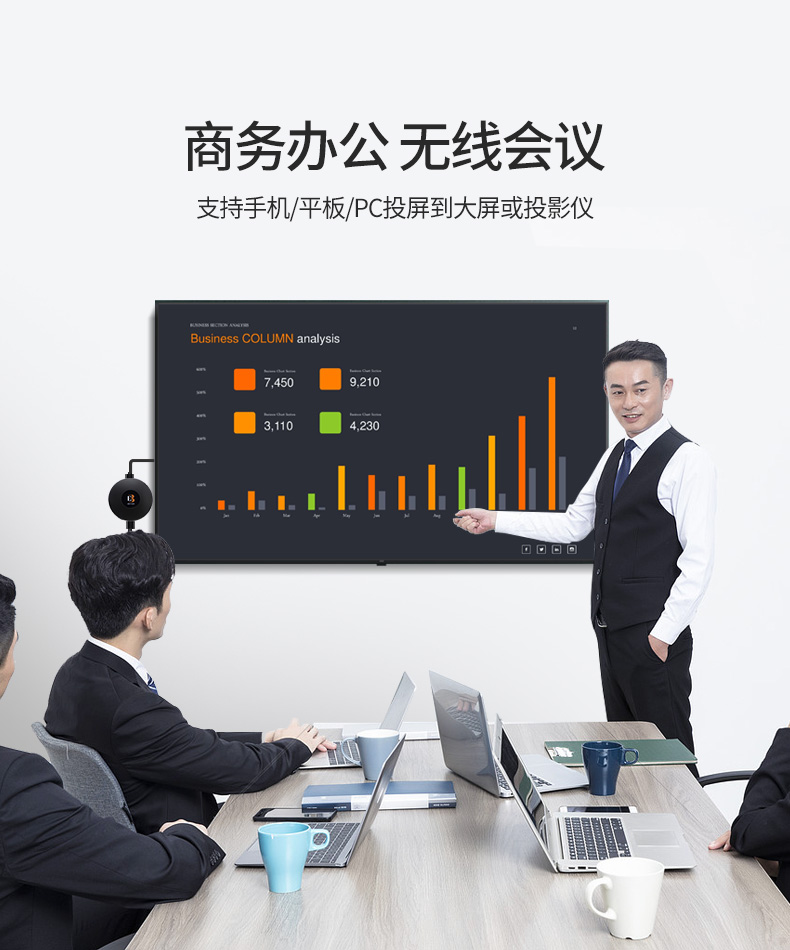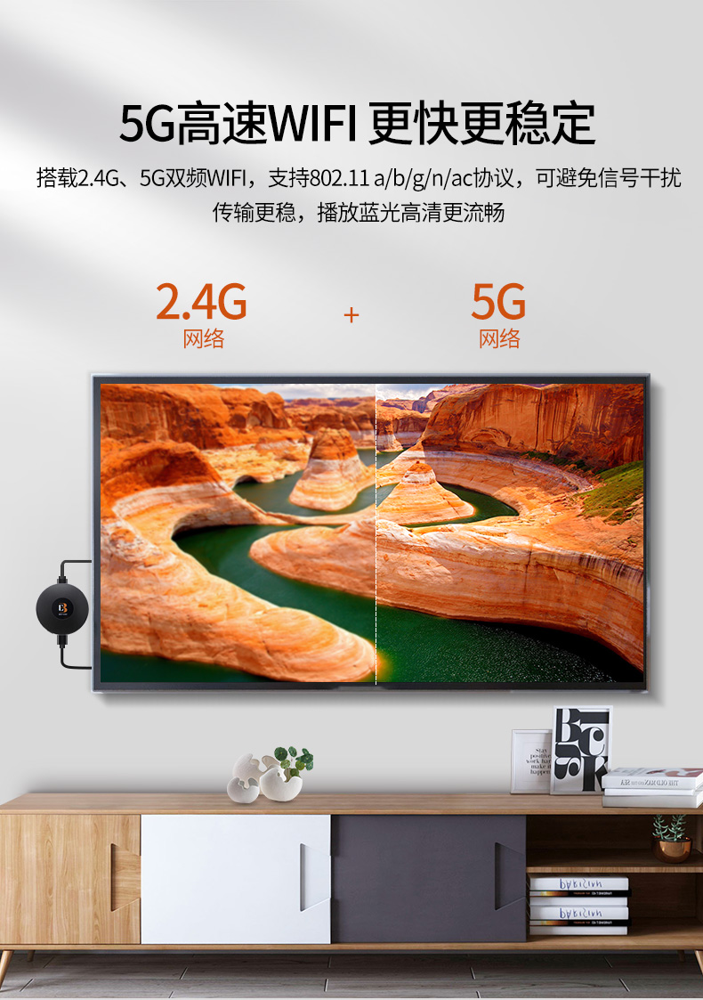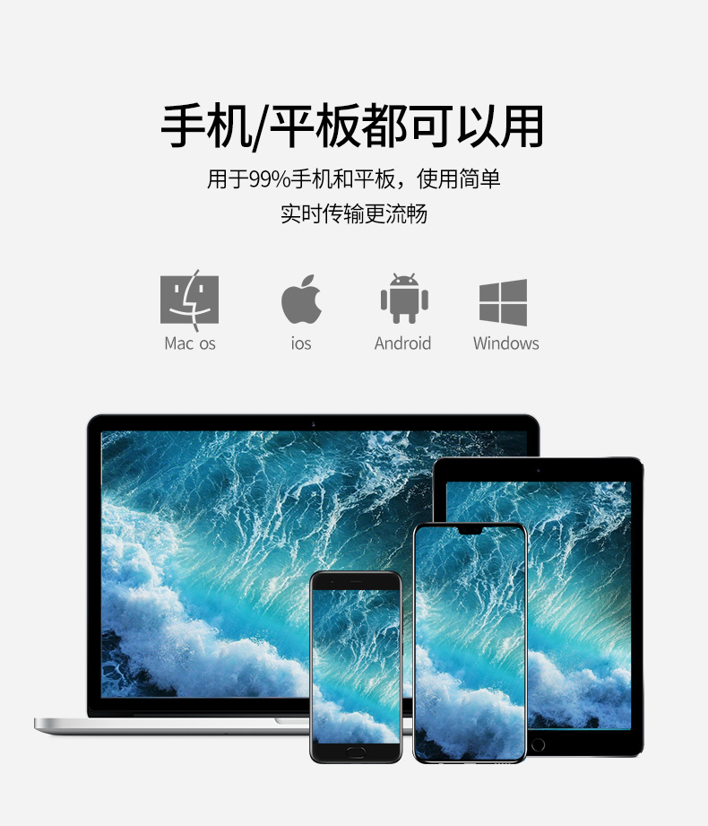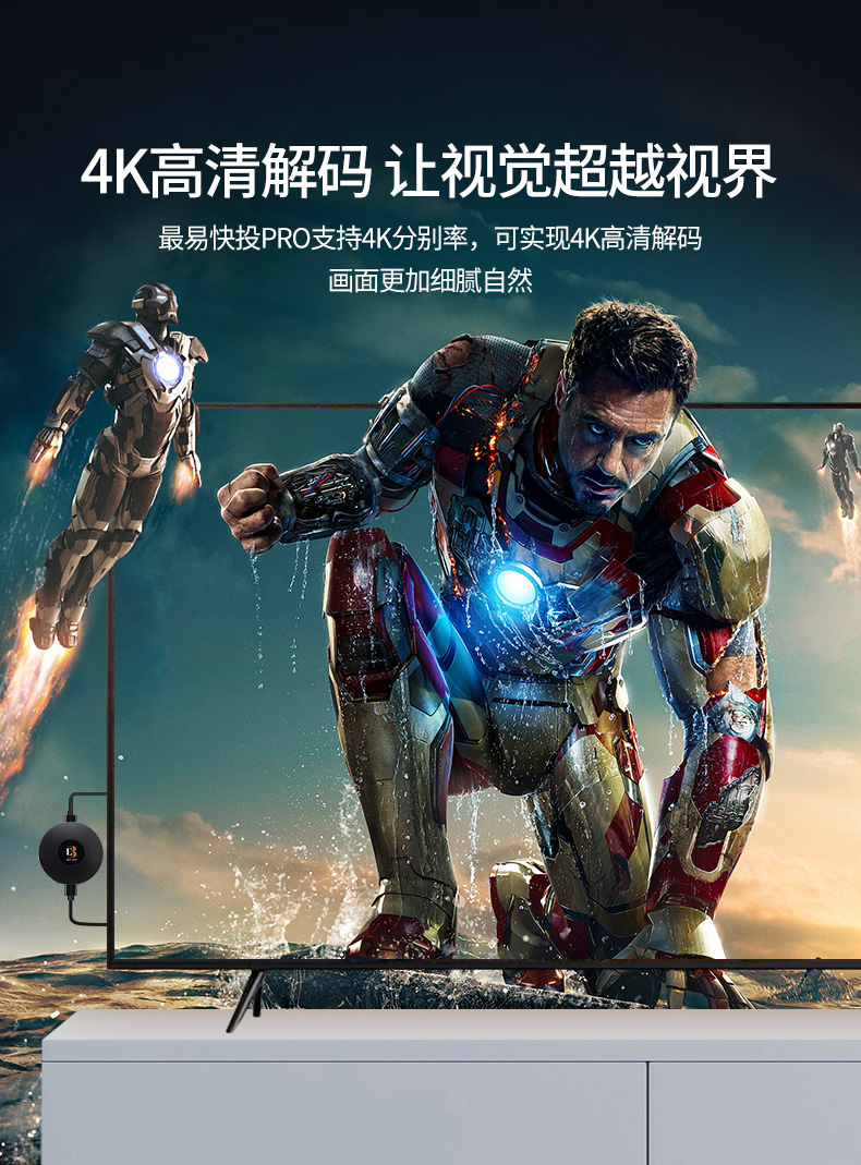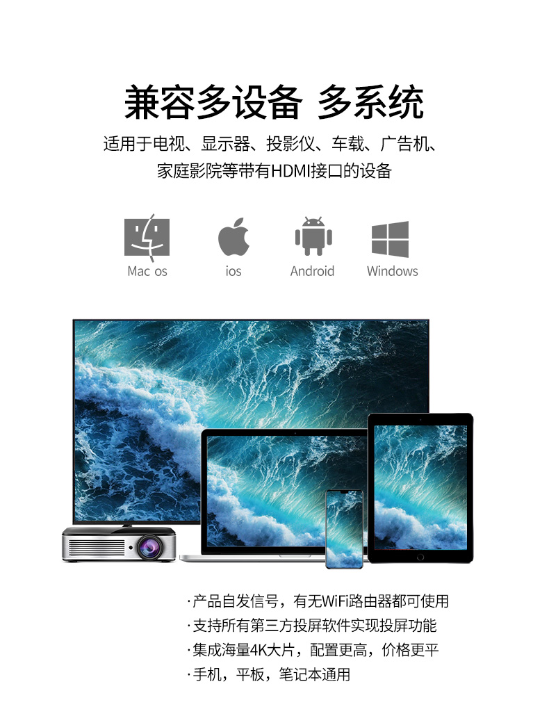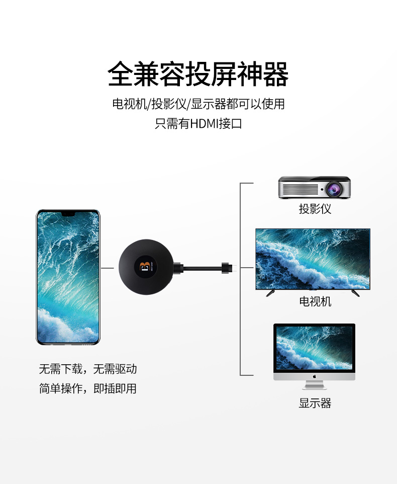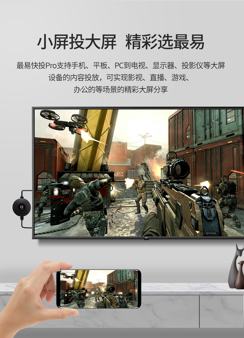 这款最易无线高清投屏器支持苹果/安卓手机、平板、PC到电视、显示器、投影仪等大屏设备的内容投放,可实现影视、直播、游戏、办公的等场景的精彩大屏分享,音质和画面同屏,即插即用。