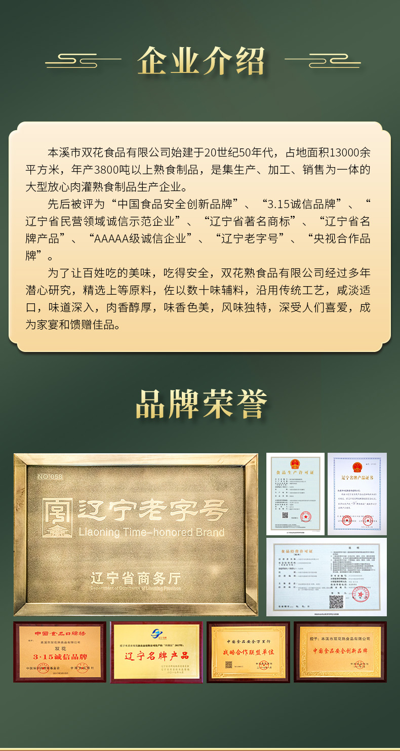 双花是本溪的老字号,也是辽宁著名商标,其肉制品配方最早可追溯到1626年清朝圣祖努尔哈赤的御制东北药膳,是正宗的东北口味,在辽宁的各大超市里都能看到他的身影。
